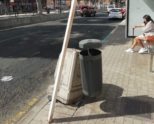 Usuarios de los servicios de guaguas en las ramblas de Arnao expresan su preocupación por el peligro que supone el deterioro de la base de una luminaria, una señal de tráfico y una papelera cerca de la parada situada frente al Edificio Don Juan.