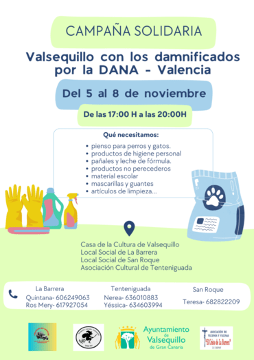 El Ayuntamiento de Valsequillo en colaboración con la Asociación de vecinos y vecinas El Cristo de La Barrera, La Asociación Cultural de Tenteniguada y la Comisión de Fiestas de San Roque, ha puesto en marcha una campaña solidaria destinada a recoger materiales esenciales para los afectados de la DANA en Valencia.