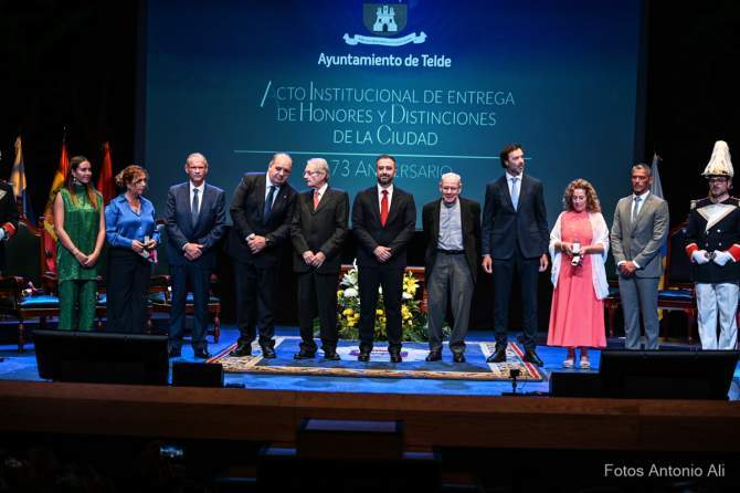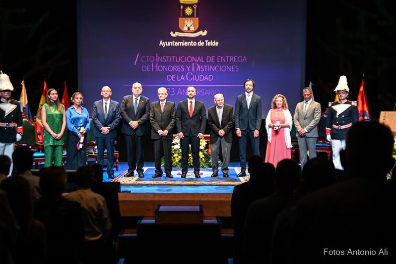 En una emotiva noche de celebración, el Teatro Juan Ramón Jiménez, con su aforo casi a tope, se vistió de gala para honrar la rica historia e identidad de Telde en su acto anual de honores y distinciones. Este jueves, conmemorando los 673 años de la fundación de Telde, la ciudad inscribió con orgullo siete nuevos nombres en su ilustre historia, reconociendo a ciudadanos ejemplares por su contribución en diferentes ámbitos. El acto congregó en coliseo teldense a numerosas personalidades del mundo político, social, económico y cultural de Telde y de la Isla, sobresalienteo la presencia de autoridades civiles y militares, el obispo auxiliar de la Diócesis, Cristóbal Déniz, y una amplia representación de la Corporación local.