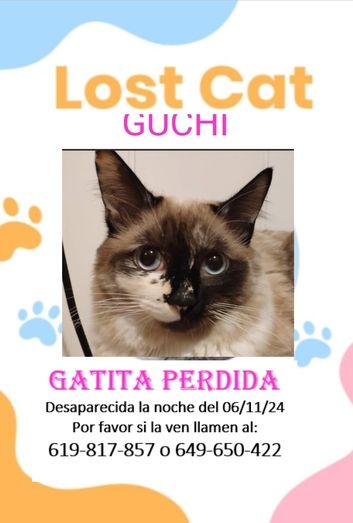Buscan a una gata que se perdió este pasado miércoles en Playa del Hombre. Sus dueños temen que el felino, que se llama Guchi, pueda estar desorientado ya que la familia se mudó recientemente a una nueva vivienda. Y que decida regresar al domicilio anterior, en Marpequeña.