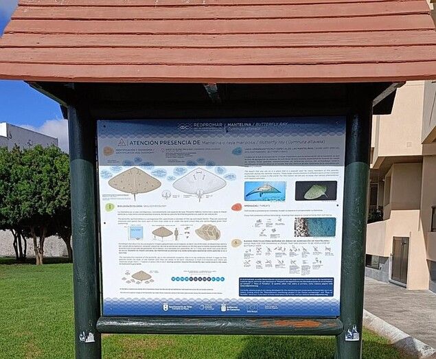 Pero, sin duda, la aportación más interesante del panel nos la oferta una página del Gobierno de Canarias: www.redpromar.org, donde podemos ampliar conocimiento e información. Se trata de una puerta abierta al conocimiento de todos los avistamientos marinos en aguas de Canarias, pero con un poco de paciencia y el objetivo claro, nos ofrece información precisa sobre las mantelinas, su biología, la situación de la especie a nivel mundial, su grado de vulnerabilidad, descripción, identificación y taxonomía, sobre las amenazas que la ponen en peligro… Por esta página web sabemos que se llevan a cabo proyectos específicos sobre el seguimiento y conservación de tan singular especie.