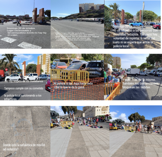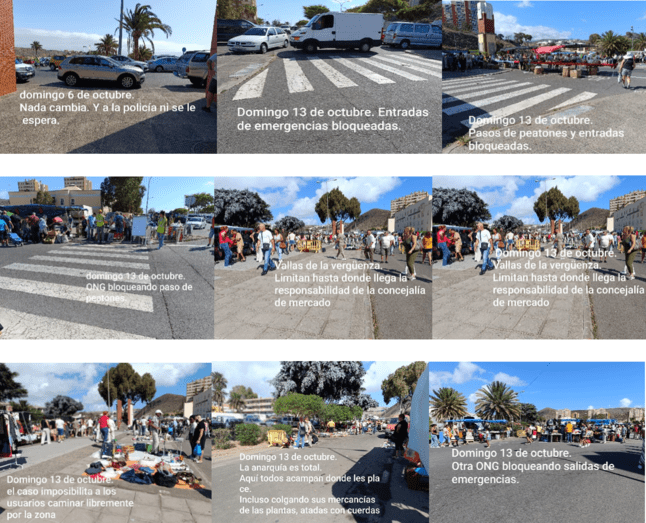 Critican la falta de presencia policial y la poca contundencia de los agentes a la hora de hacer cumplir la normativa y sancionar. En concreto, alertan del bloqueo de las salidas de emergencia y de los accesos generales, de la ocupación de aceras, calles y pasos de peatones por parte de vehículos y de los propios puestos. También reprochan la utilización de árboles para colgar la mercancía que se vende y la utilización de los parterres y las aceras como aparcamientos.