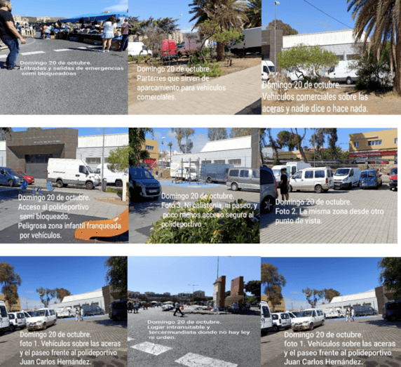 También critican que no se respeten las plazas de aparcamiento reservadas para personas con movilidad reducida. Y que se bloqueen los accesos al polideportivo Juan Carlos Hernández o al parque infantil infantil y a la zona de calistenia.
