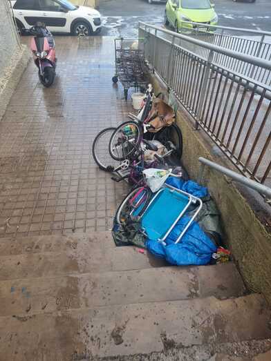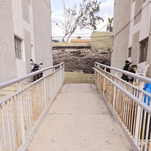 Vecinos de los edificios de Los Marinos, en Melenara, se quejan de que un nuevo residente utiliza la zona peatonal que une las dos edificaciones como un aparcamiento ilegal de motocicletas y un espacio de almacenamiento de sus enseres y chatarra.
