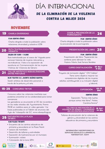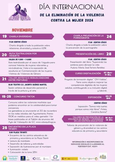 La programación, que se desarrollará a lo largo del mes de noviembre, incluye charlas informativas, rutas teatralizadas, talleres artísticos, presentaciones de libros, exposiciones y encuentros para visibilizar la problemática de la violencia machista y sus diferentes manifestaciones y sensibilizar a la población sobre la importancia de prevenir y erradicar esta lacra.