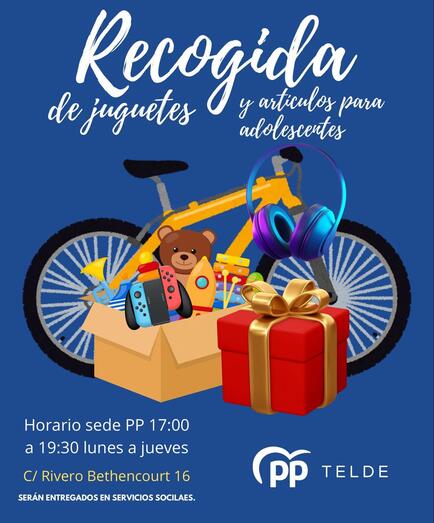 El Partido Popular de Telde iniciará la recogida de juguetes y objetos de uso personal para adolescentes y mayores del municipio, los cuales serán entregados a la Concejalía de Servicios Sociales del Ayuntamiento de Telde, todo ello dirigido a la campaña de Navidad.