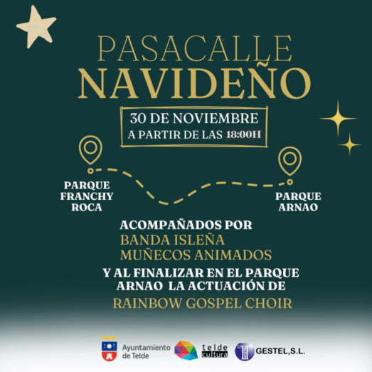 La Banda Isleña, acompañada de personajes Disney, se encargará de poner el ritmo al desfile anunciador del comienzo de la campaña navideña. El recorrido culminará en el parque Arnao, que en esta edición se convertirá nuevamente en el Jardín de la Navidad de Telde. A las 18.30 horas se realizará el esperado encendido, llenando de luz y magia este emblemático espacio. Poco a poco se irán encendiendo el resto de decoraciones de la ciudad.