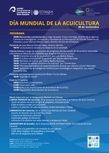 Este evento, que incluirá un completo programa de charlas, tiene como objetivo sensibilizar a la sociedad canaria sobre la relevancia científica y socioeconómica de la acuicultura como herramienta clave para la seguridad alimentaria y la sostenibilidad del planeta.