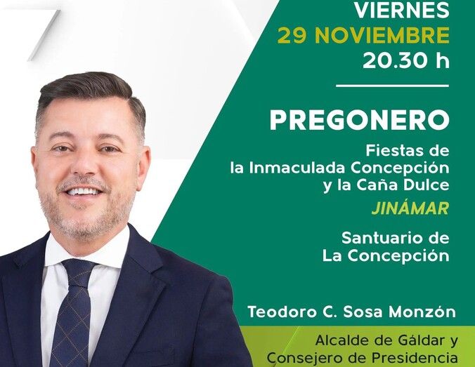 El santuario de La Concepción, en Jinámar, se llenó de emoción la noche de este viernes durante la lectura del pregón de las Fiestas de la Inmaculada Concepción y la Caña Dulce, a cargo de Teodoro Sosa, alcalde de Gáldar y consejero de Presidencia del Cabildo de Gran Canaria. El acto abarrotó de público el templo y entre los asistentes se encontraban el alcalde Juan Antonio Peña, ediles de las Corporaciones de Telde y Gáldar, las diputadas regionales Sonsoles Martín y Mónica Muñoz, y un nutrido grupo de vecinos.