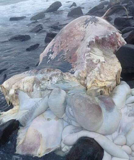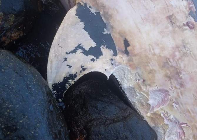.Por ahora se desconocen las causas del fallecimiento, pero el cetáceo se encuentra en avanzado estado de descomposición y presenta múltiples mordeduras de tiburón.