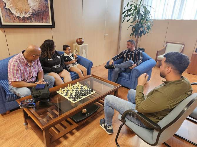 El teldense prebenjamín de lucha canaria, Ángel Casimiro Rodríguez, visitó este jueves Alcaldía del Ayuntamiento de Telde para compartir con el alcalde de la ciudad, Juan Antonio Peña, y el concejal de Deportes, Cristhian Santana, su trofeo de campeón tras disputar, el pasado 17 de noviembre, el V Torneo del Fajín de Lucha Canaria.
