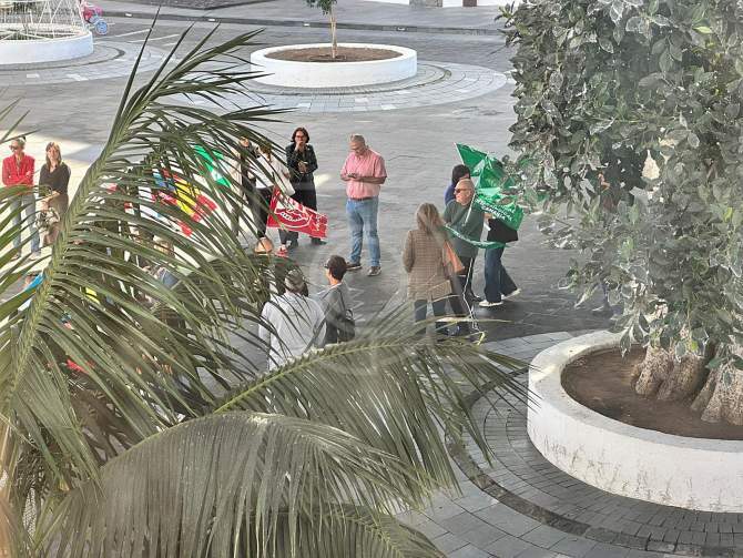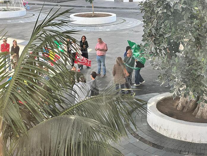 Un grupo de trabajadores municipales, enarbolando banderas de los sindicatos UGT, CSIF e Intersindical Canaria, se ha concentrado en la plaza de Juan, frente a las Casas Consistoriales, mientras se celebraba el Pleno corporativo.