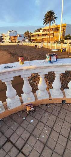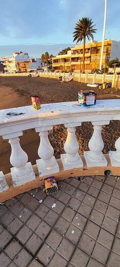 A primera hora de la mañana, el panorama en el paseo costero era desolador. Amplios tramos del recorrido estaban cubiertos de restos de petardos, papeles quemados y otros desechos, dando una imagen de abandono y falta de civismo. Una de las áreas más afectadas fue el mirador dedicado a Dolores Álvarez, benefactora local, junto al puesto de vigilancia del servicio de salvamento y socorrismo.