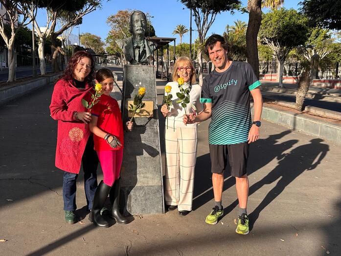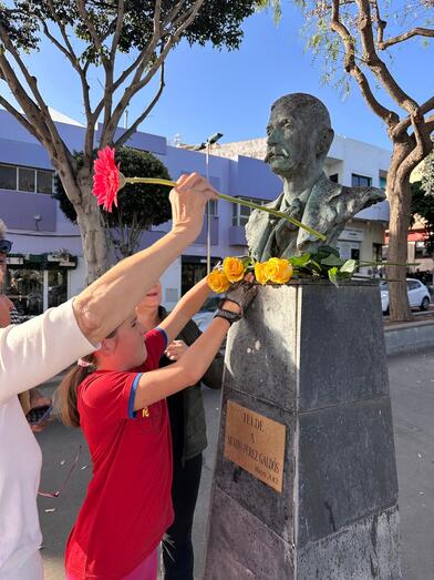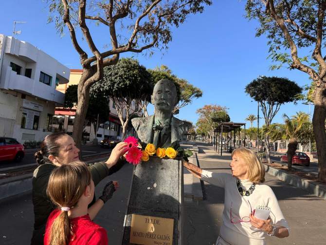Ayer por la mañana, un grupo de vecinos de Telde, entre los que se encontraba la conocida maestra Julia Arnaiz Castro, se dio cita en las ramblas de la Avenida del Cabildo, donde se encuentra el busto de Galdós, para rendirle un homenaje sencillo pero emotivo. Con una flor como ofrenda, los asistentes recordaron al autor de obras inmortales como Fortunata y Jacinta y Los Episodios Nacionales, recuperando así el compromiso de honrar su figura.