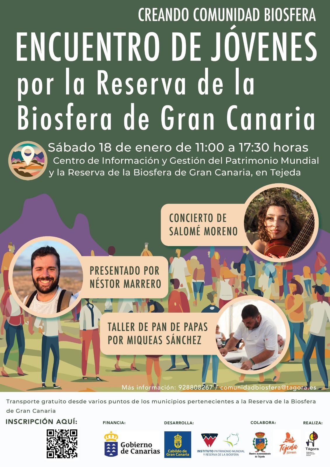 El Centro de Información y Gestión del Patrimonio Mundial y la Reserva de la Biosfera de Gran Canaria del Cabildo, situado en el casco de Tejeda, acogerá el próximo sábado 18 de enero el ‘Encuentro de Jóvenes por la Reserva de la Biosfera de Gran Canaria’, encuentro que incluirá música, un taller de elaboración de pan de papas o el acercamiento a diversas experiencias que vinculan territorio y sostenibilidad.
