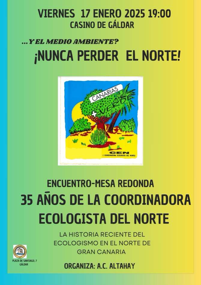 En un emotivo acto celebrado este pasado viernes en El Casino de Gáldar, la Coordinadora Ecologista del Norte conmemoró sus 35 años de lucha y conservación del territorio y su biodiversidad. La celebración contó con la presencia de diversas asociaciones medioambientales de los municipios de Firgas, Arucas, Moya, Gáldar, Guía, Agaete y La Aldea de San Nicolás.