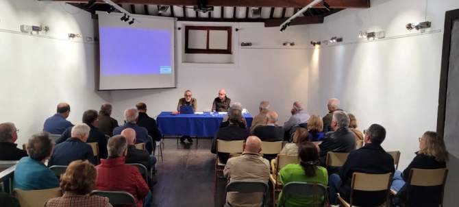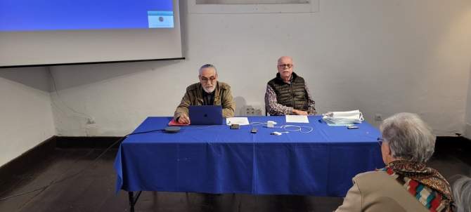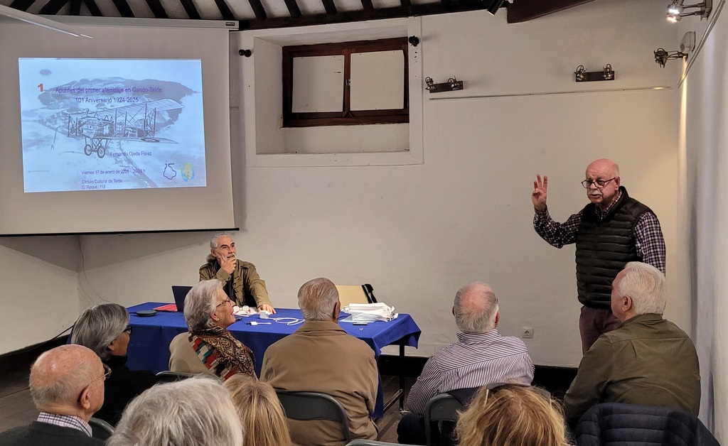 Presentado por el secretario de la entidad cultural, Antonio Alemán Gil, que esboza el perfil académico de Fernando Ojeda, ingeniero industrial, colaborador y difusor de la dinámica cultural de Telde y Gran Canaria, nuestro ponente expone con la generosidad, genio y empatía que le caracteriza la singular historia de nuestro aeropuerto.