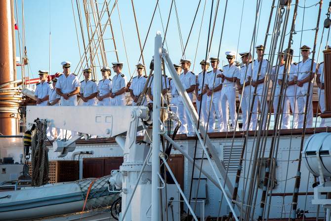 El 'Juan Sebastián de Elcano' cuenta con 240 personas a bordo, algo más de 30 mujeres, mientras que los guardamarinas comienzan su jornada a las 07.00 intercalando clases y maniobras, culminando con un rato de tiempo libre al caer la tarde noche.
