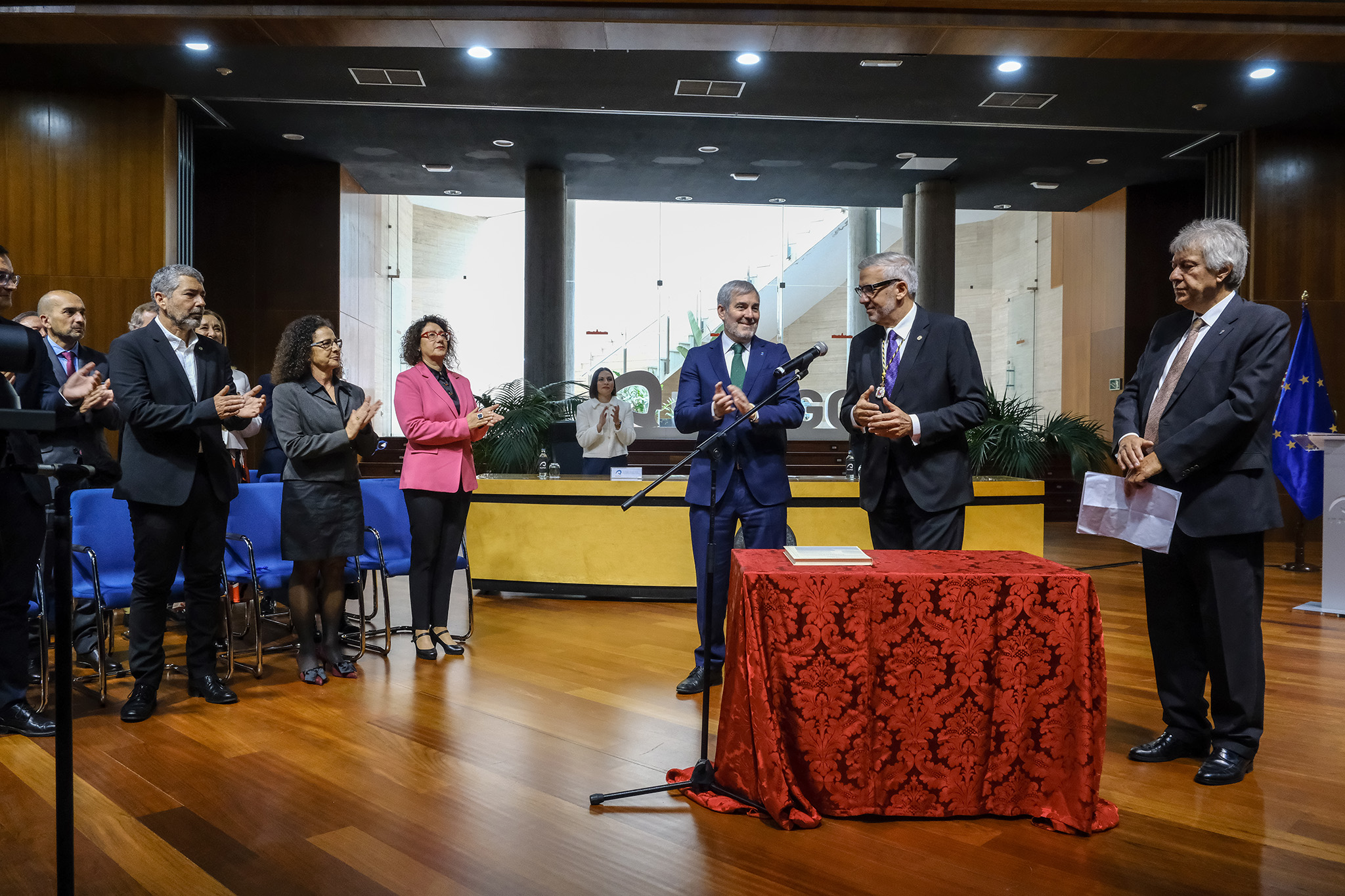 Junto al Rector de la ULPGC, antes de tomar posesión de su cargo, le acompañaron en el escenario del Paraninfo los anteriores Rectores de la institución académica: Francisco Rubio Royo, Manuel Lobo Cabrera, José Regidor García y Rafael Robaina Romero. Además, asistió al acto el Rector de la Universidad de La Laguna, Francisco García Rodríguez.