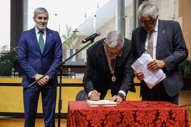 El acto de toma de posesión del Rector y su equipo, hoy 28 de enero de 2025, ha contado con la presencia de las principales autoridades públicas y académicas, encabezadas por el presidente de Canarias. Junto a él, en la mesa presidencial estuvieron presentes la consejera de Universidades, Ciencia, Innovación y Cultura, Migdalia Machín; y la Presidenta del Consejo Social de la ULPGC, Ana Suárez.