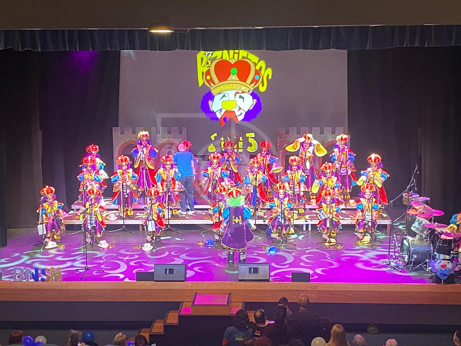Con el aforo completamente abarrotado y bajo la fantasía Llegó el rey carnavalero para conquistarte este febrero, los pequeños murgueros lucieron con gracia y mucha ilusión sus disfraces de reyes, hechos por Juani Sánchez. Con ellos sobre el escenario, tras cantar su pasacalles y entrada, dieron a conocer, por primera vez, los dos temas que los representarán este Carnaval 2025 Con nuestras voces y pensamientos y, la segunda, Aquí, ¡Yo soy el king!, por orden de interpretación.