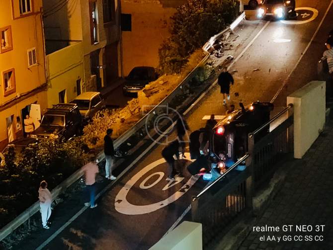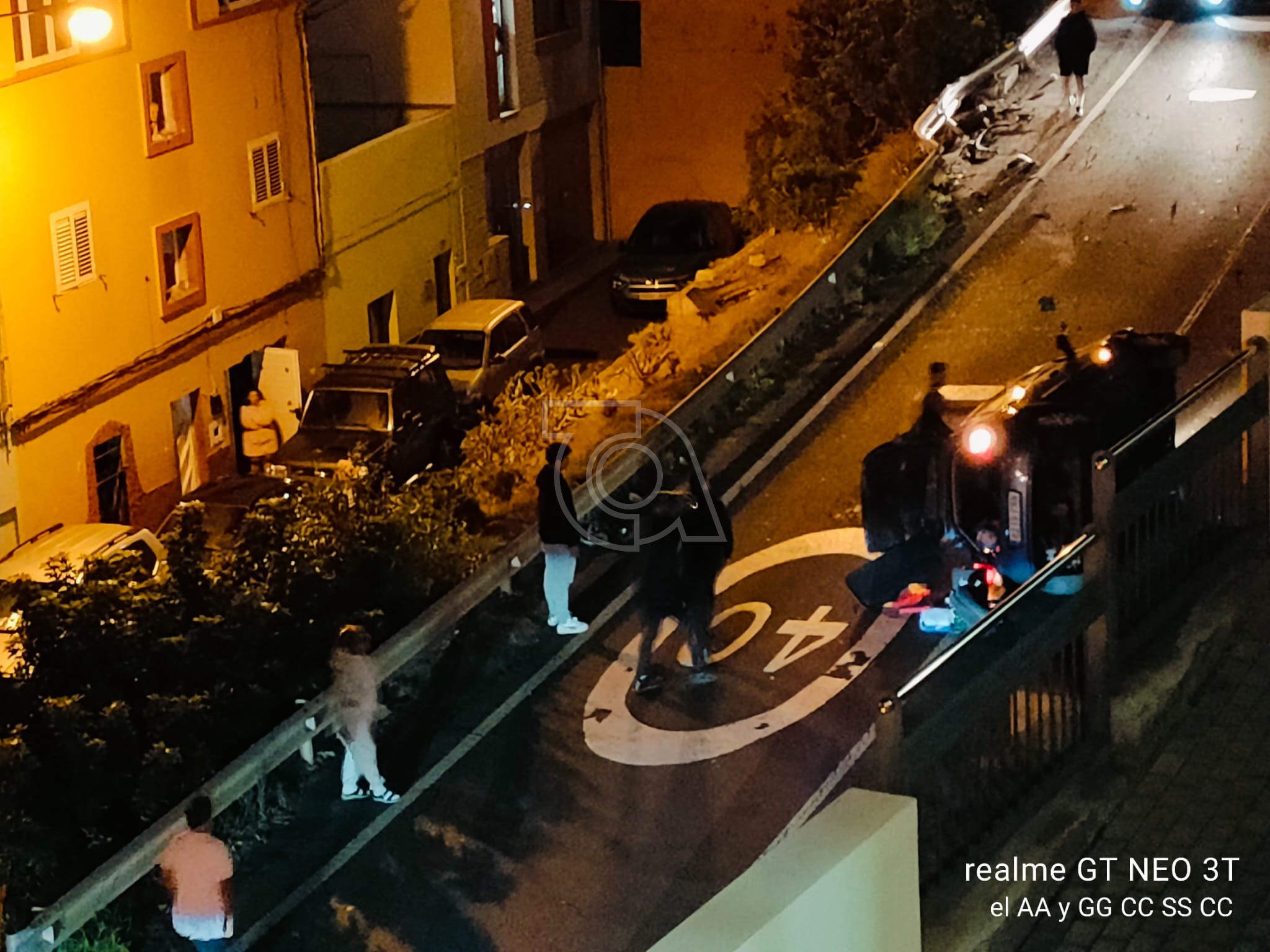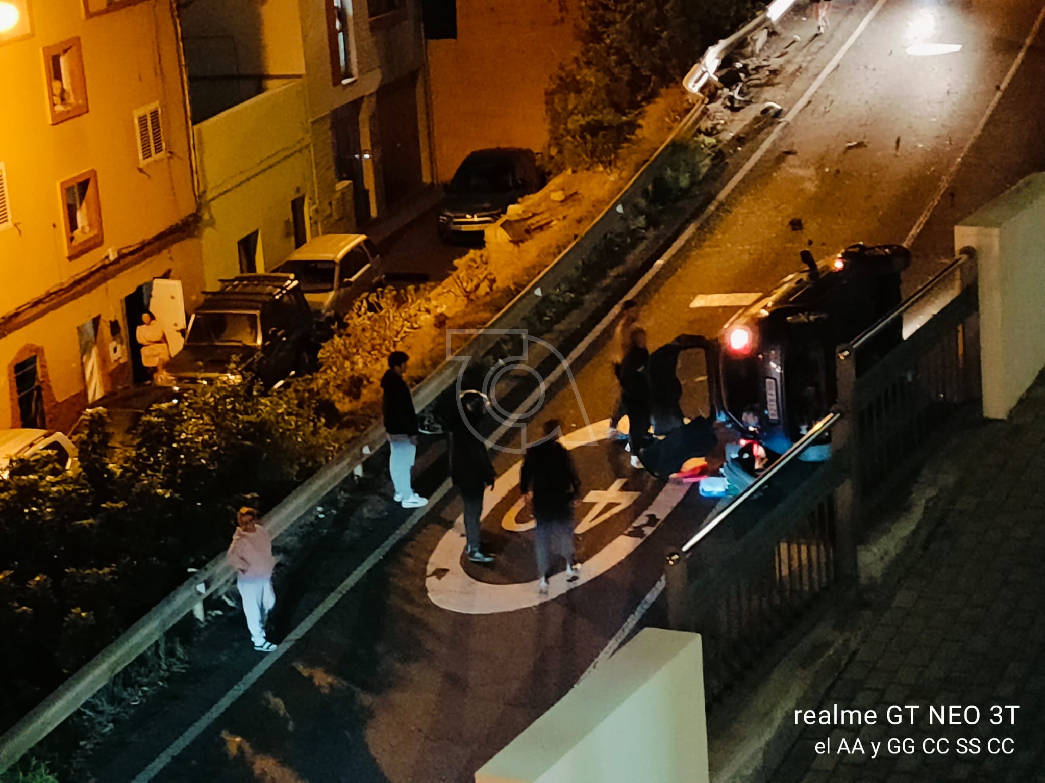 Un aparatoso accidente de tráfico tuvo lugar en Telde a medianoche de este lunes, cuando un vehículo, circulaba en sentido norte, volcó en la carretera GC-100, a la altura de Lomo Cementerio, después de chocar con unas vallas metálicas protectoras. El incidente ocurrió cerca en la curva donde la vía toma el nombre de José López Suárez, en la entrada al barrio en dirección sur.