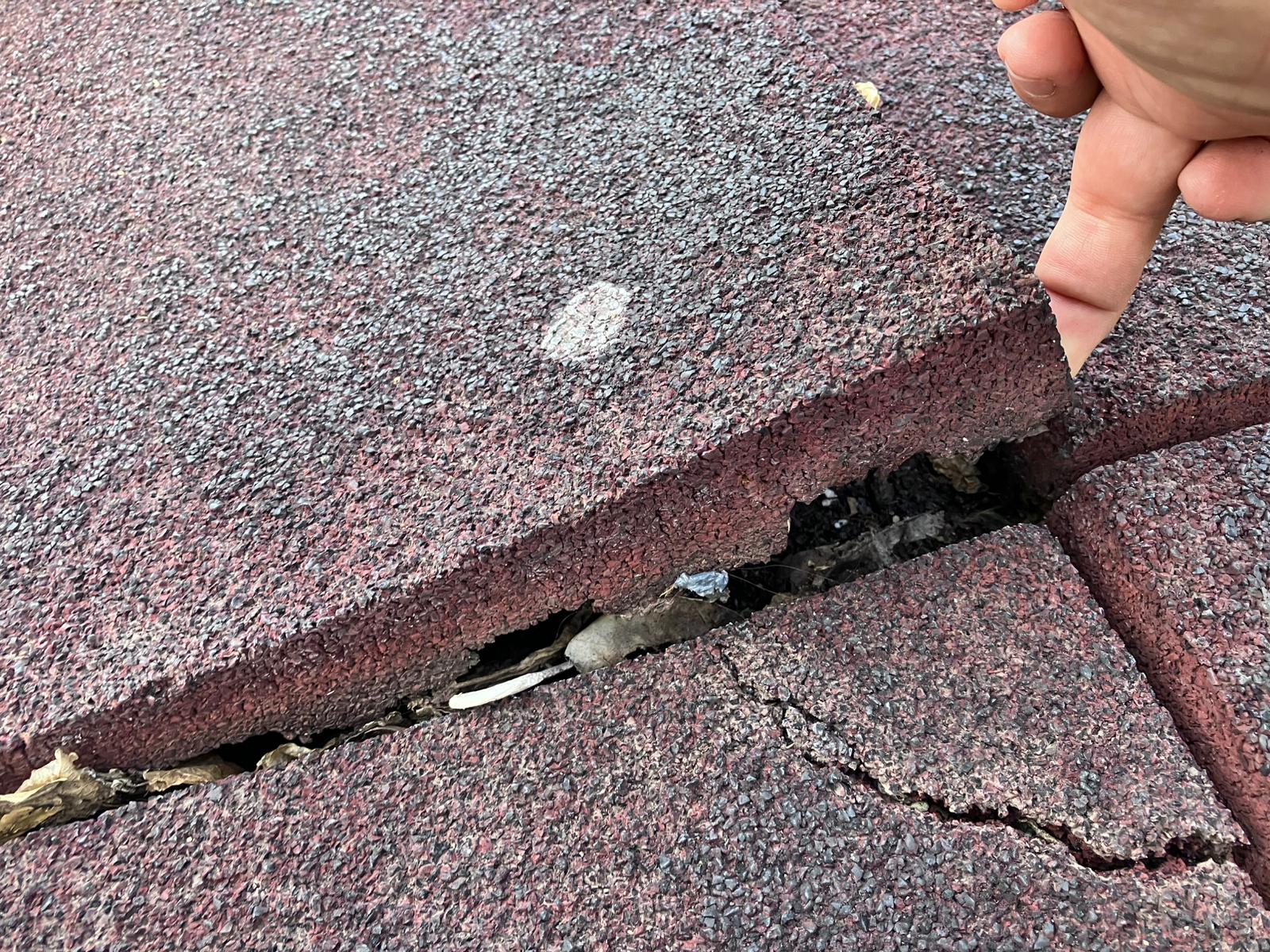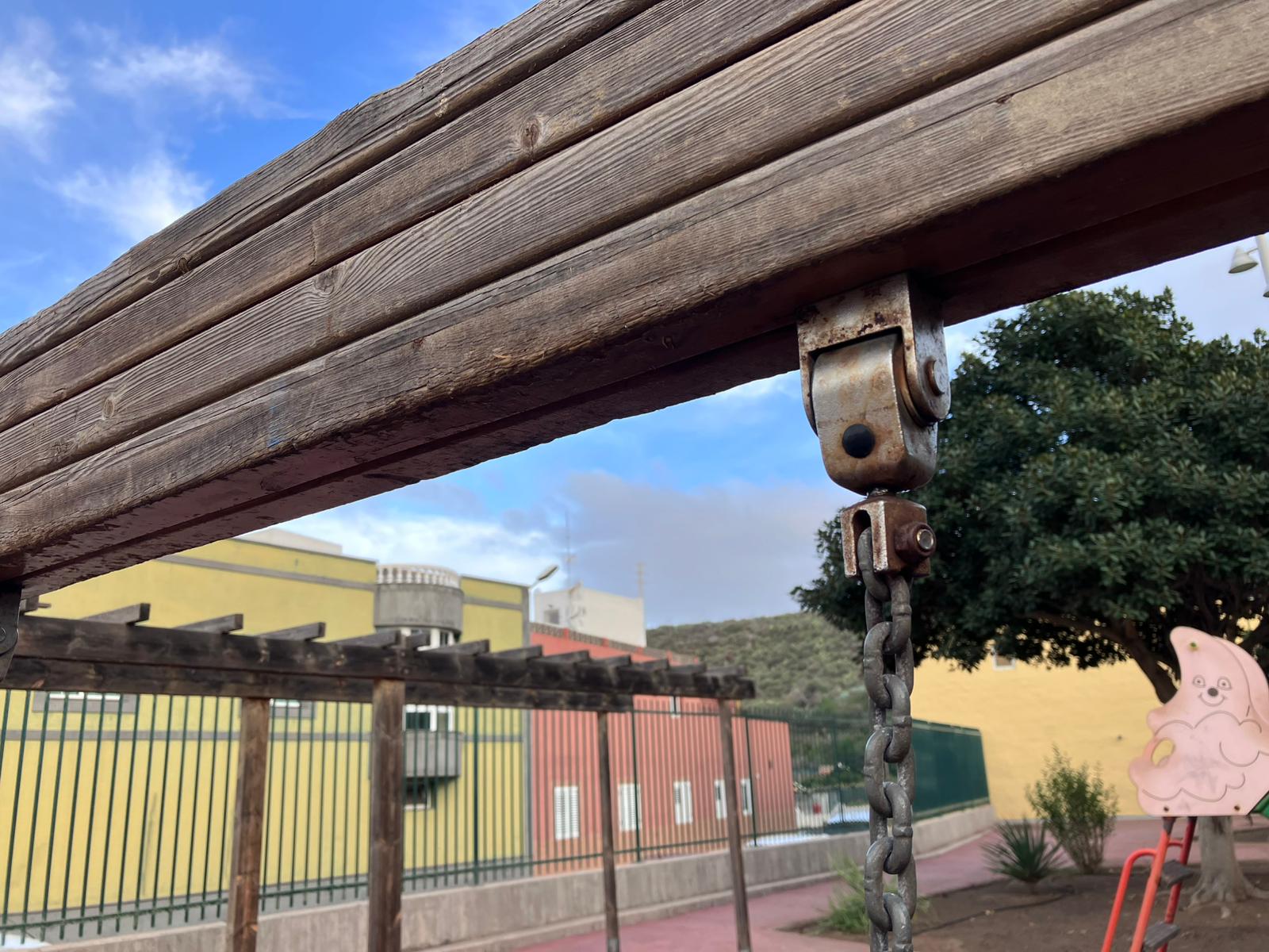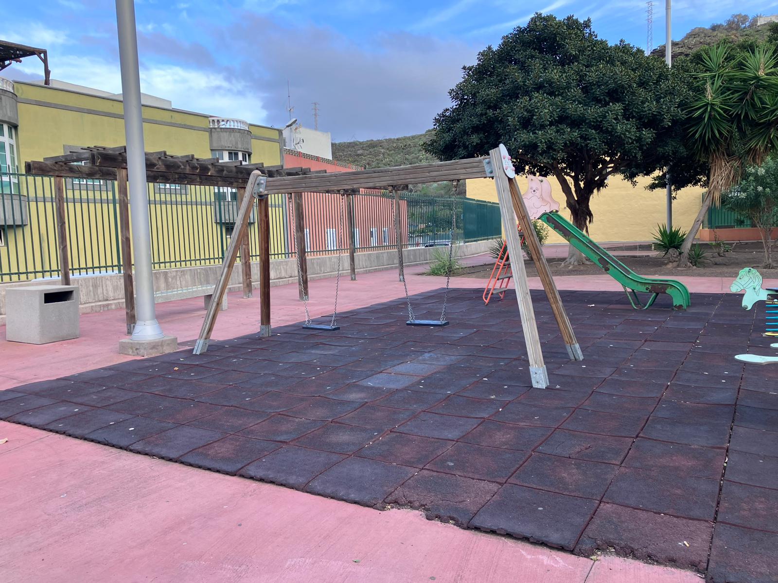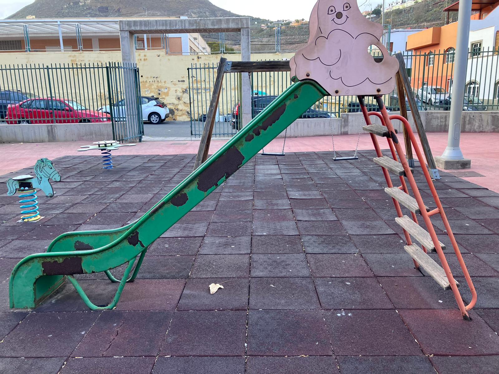 Según denuncian, el parque presenta baldosas rotas y sueltas, cadenas oxidadas en los juegos de remos y escalones del tobogán en mal estado, lo que supone un riesgo evidente de accidentes para los niños.