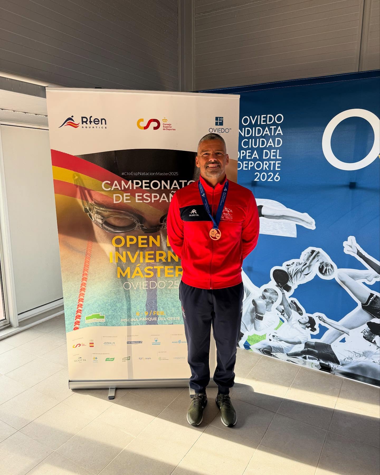 El concejal de Actividad Física y Deportes del Ayuntamiento de Telde, Cristhian Santana Caballero, celebra la medalla de bronce lograda por el nadador del Club Natación Faynagua – Ciudad de Telde Miguel Santana en los XXX Campeonatos de España Open de Invierno Máster, celebrados en el Parque de Oeste, Oviedo, Asturias, del 6 al 9 de febrero.