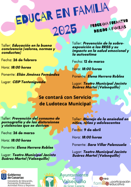 El programa contará con servicio gratuito de Ludoteca Municipal para facilitar la asistencia de las familias con hijos pequeños. "Estamos muy contentos de poder ofrecer una nueva edición de este programa en Valsequillo. Creemos que es fundamental brindar a los padres y madres herramientas y recursos para afrontar los desafíos que plantea la educación de los hijos en la actualidad. Los talleres abordarán temas muy relevantes y además, para facilitar la asistencia de las familias, contaremos con un servicio gratuito de ludoteca municipal. Invitamos a todas las familias de Valsequillo a participar en este programa y aprovechar esta oportunidad para aprender y compartir experiencias", señalaba al respecto la concejala del Centro Integral de Servicios Sociales, Leticia Ortega.
