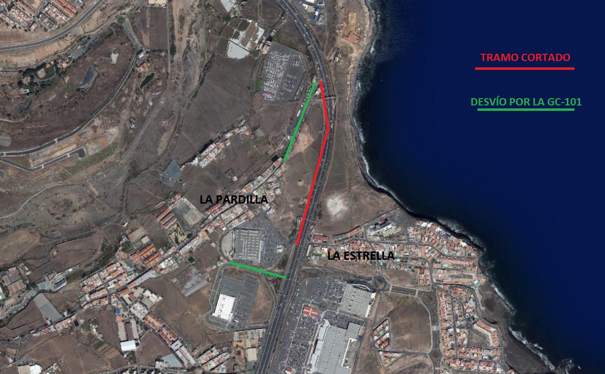 El primer corte, de apenas un kilómetro y que empieza este domingo de 23:00 a 6:00 horas, se centrará en la reparación de las pasarelas de La Pardilla y la de La Estrella, por lo que se hace necesario el corte de la vía en sentido al sur de la isla. Para los conductores afectados por este corte se establece un desvío por la GC-101, carretera de La Pardilla, hasta conectar con la rotonda de Makro y de ahí volver de nuevo a la autovía.