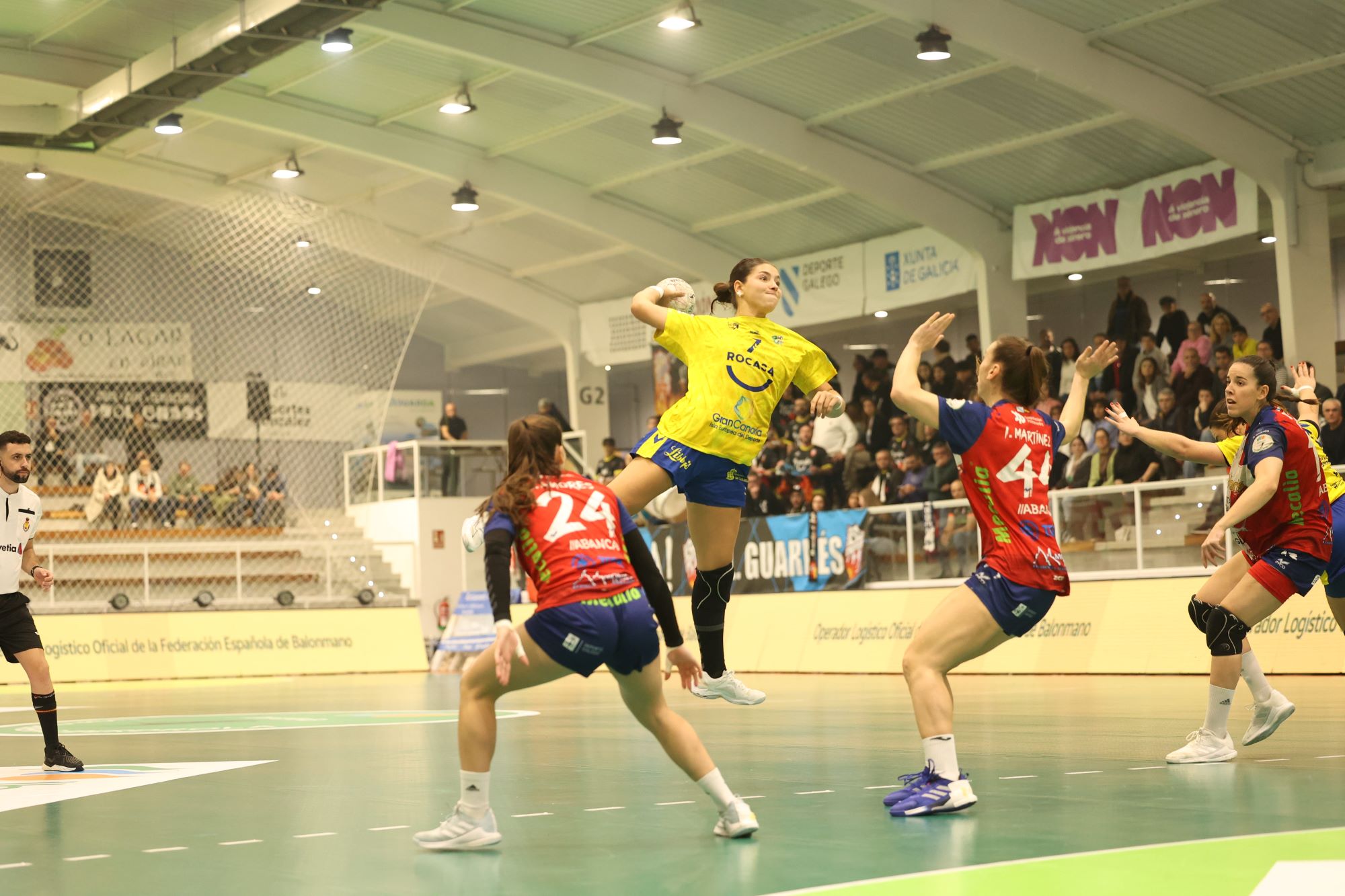Almudena, Martina Lang y María Zaldua destacaron en el ataque canario, manteniendo a su equipo cerca en el marcador. Silvia Navarro brilló con paradas decisivas para evitar que las gallegas rompieran el partido a las primeras de cambio. Entretanto, la entrenadora local, Ana Cristina Teixeira, buscaba más efectividad en cada lanzamiento y mayor precisión en las decisiones en pista.