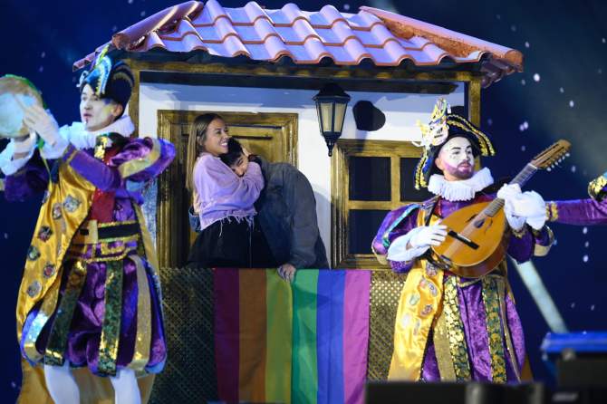 En su segundo tema, "Aquí tocaba un tema de humor, pero lo primero es lo primero", transformaron el escenario en una Superbowl canaria, con una lucha simbólica que representó los problemas de las islas: la crisis de vivienda, el turismo de masas, la falta de oportunidades para los jóvenes o los efectos del volcán en La Palma. En uno de los momentos más reivindicativos de la noche, exclamaron desde Tenerife: "No soy un parque acuático ni un zoológico", en clara crítica a la imagen turística del Archipiélago.