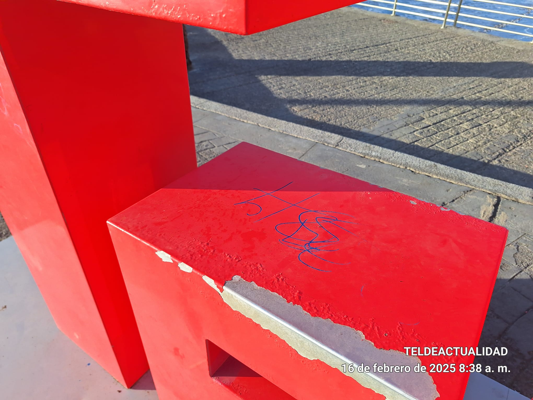 Sin embargo, a día de hoy su aspecto deja mucho que desear. Tal y como denuncian vecinos de la zona, la pintura de color rojo que cubre las letras se ha levantado por varios puntos. Además, ha sufrido los efectos del vandalismo, con pintadas y pegatinas que afean su estética.
