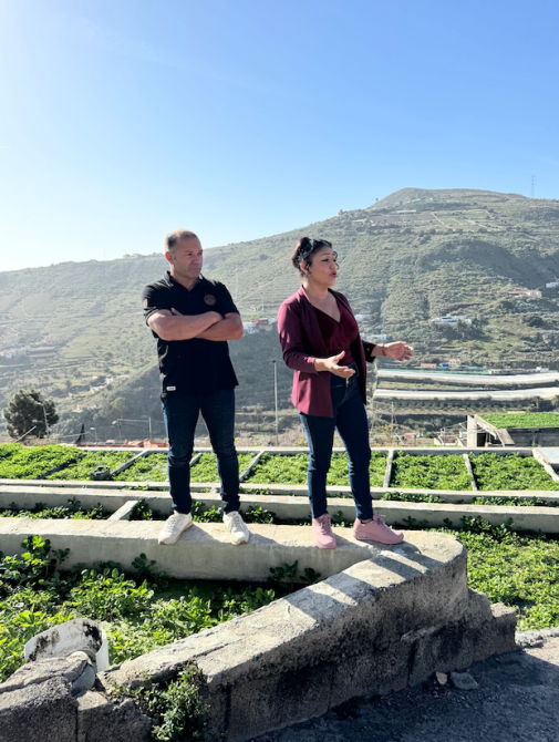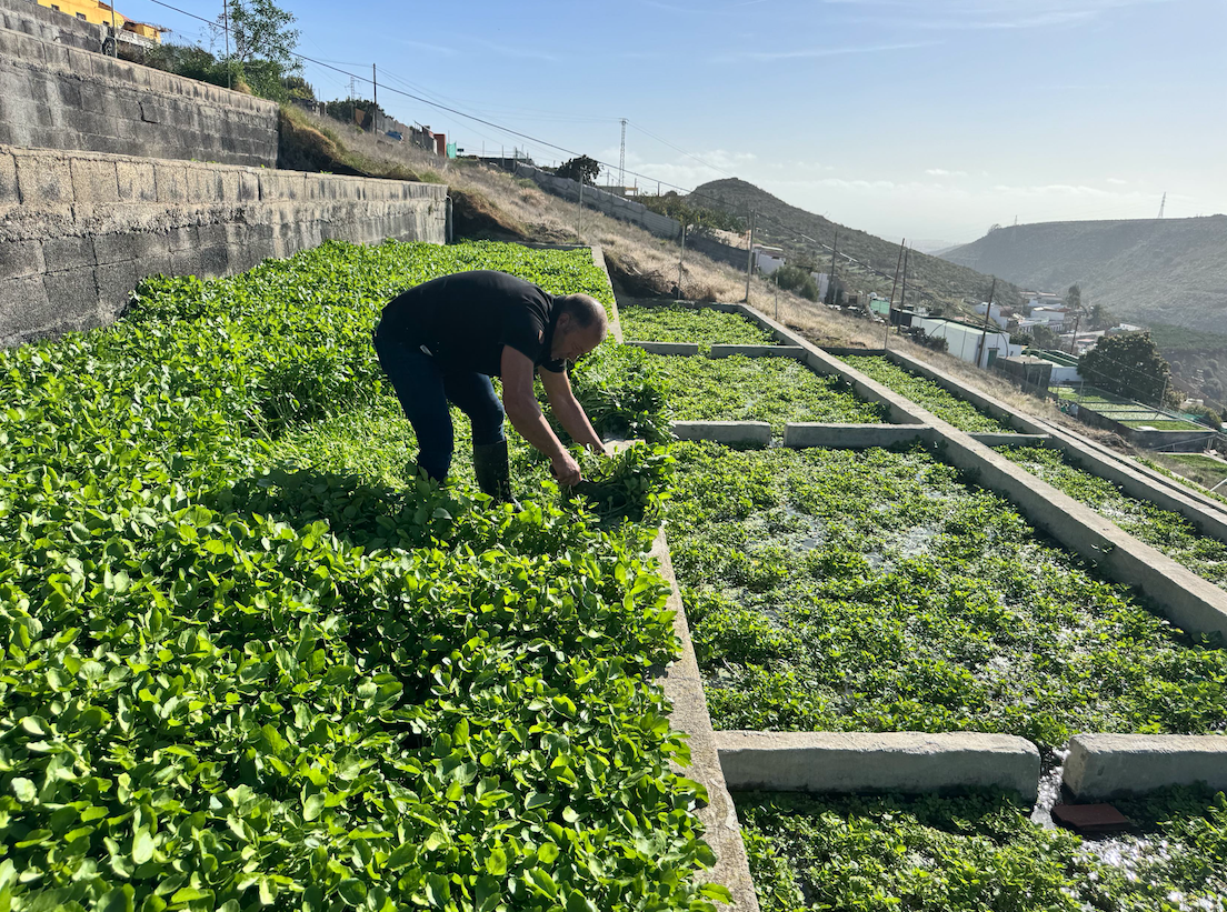 Durante el recorrido por las nateras de la Solana, propiedad de Francisco Verde y Roxana Orellana, los participantes conocieron de primera mano las particularidades del cultivo del berro, un producto emblemático de la gastronomía canaria, consumido tradicionalmente en caldos y ensaladas. Además, se reflexionó sobre los desafíos que enfrenta este cultivo, especialmente la falta de precipitaciones y la necesidad de agua de calidad, factores que ponen en riesgo su producción.