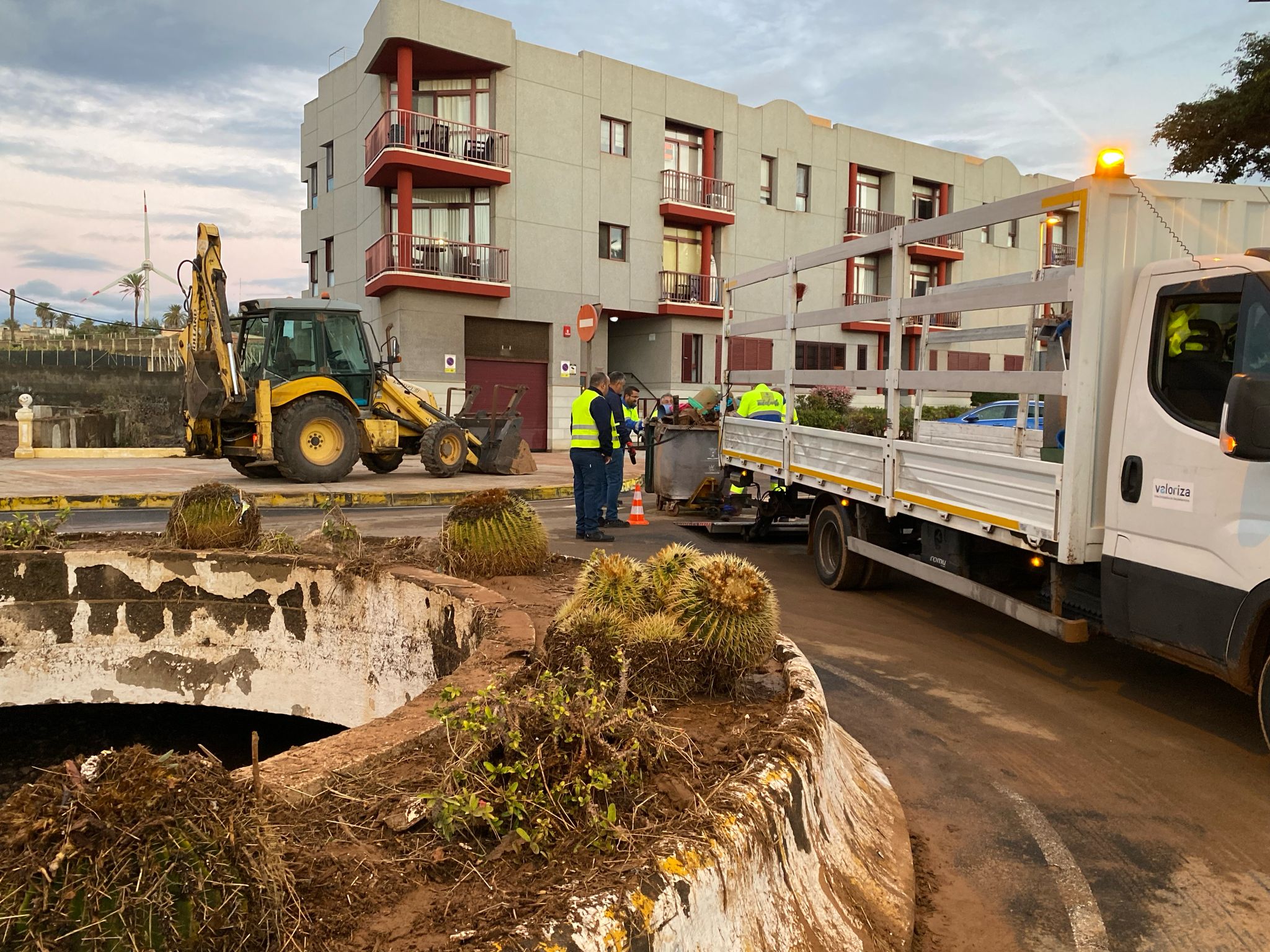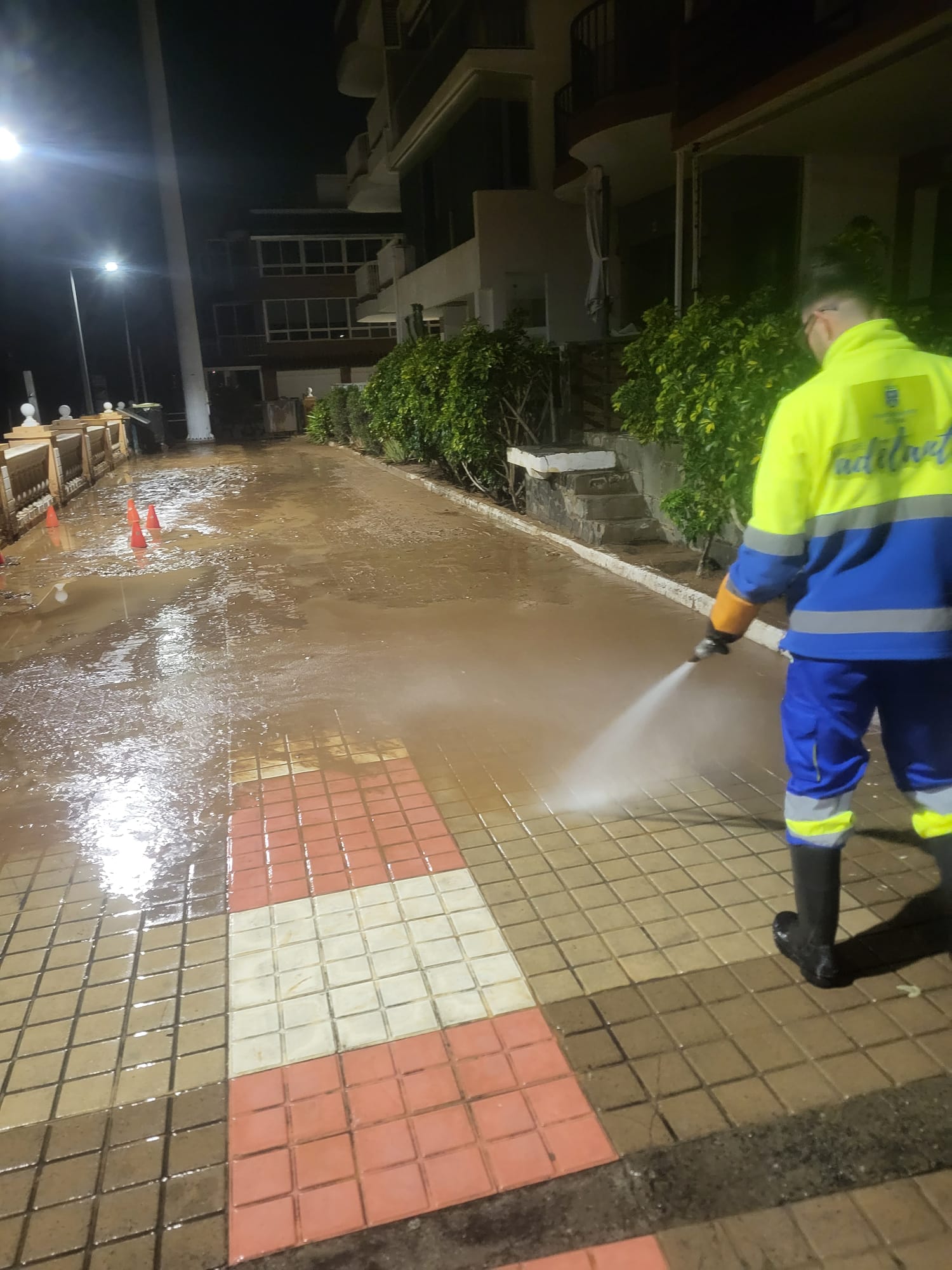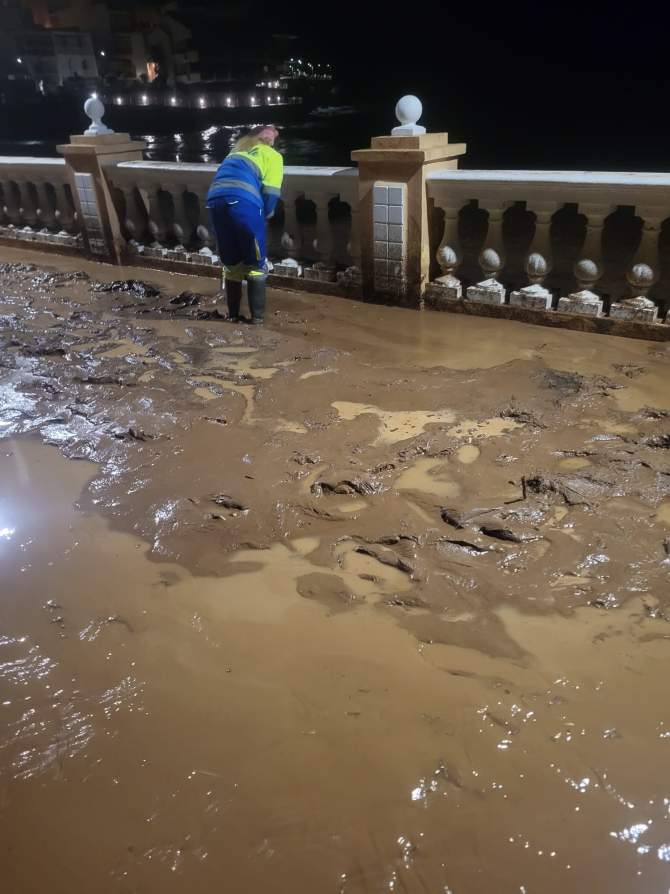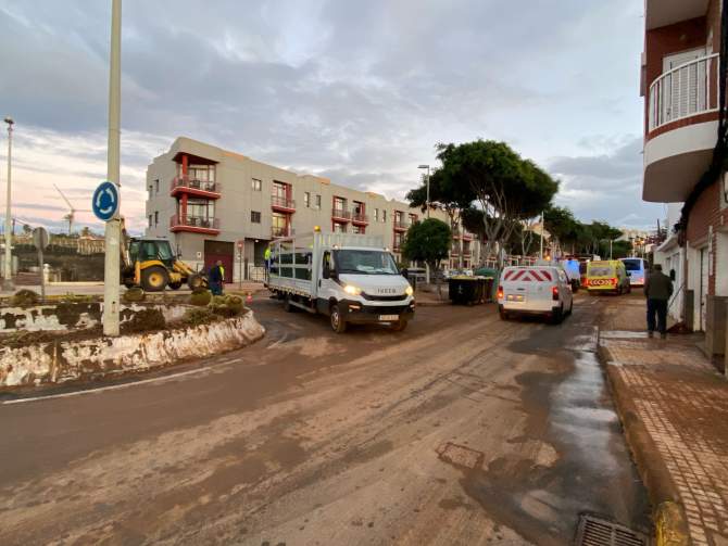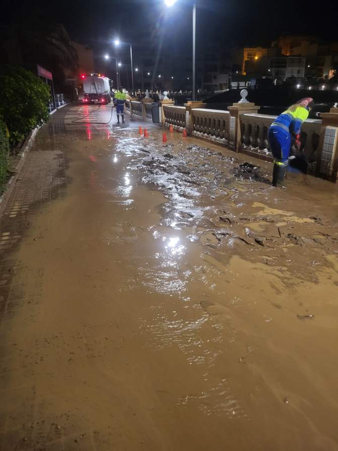 Desde primera hora de la mañana de este martes, los servicios municipales, especialmente los operarios de Limpieza Viaria de la empresa Valoriza (concesionaria del servicio), han retomado las tareas de retirada de lodo, barro y residuos, después de que el desbordamiento del barranquillo que desemboca en la playa inundara garajes, arrastrara un vehículo al mar y cubriera calles y aceras con escombros, ramas y piedras.
