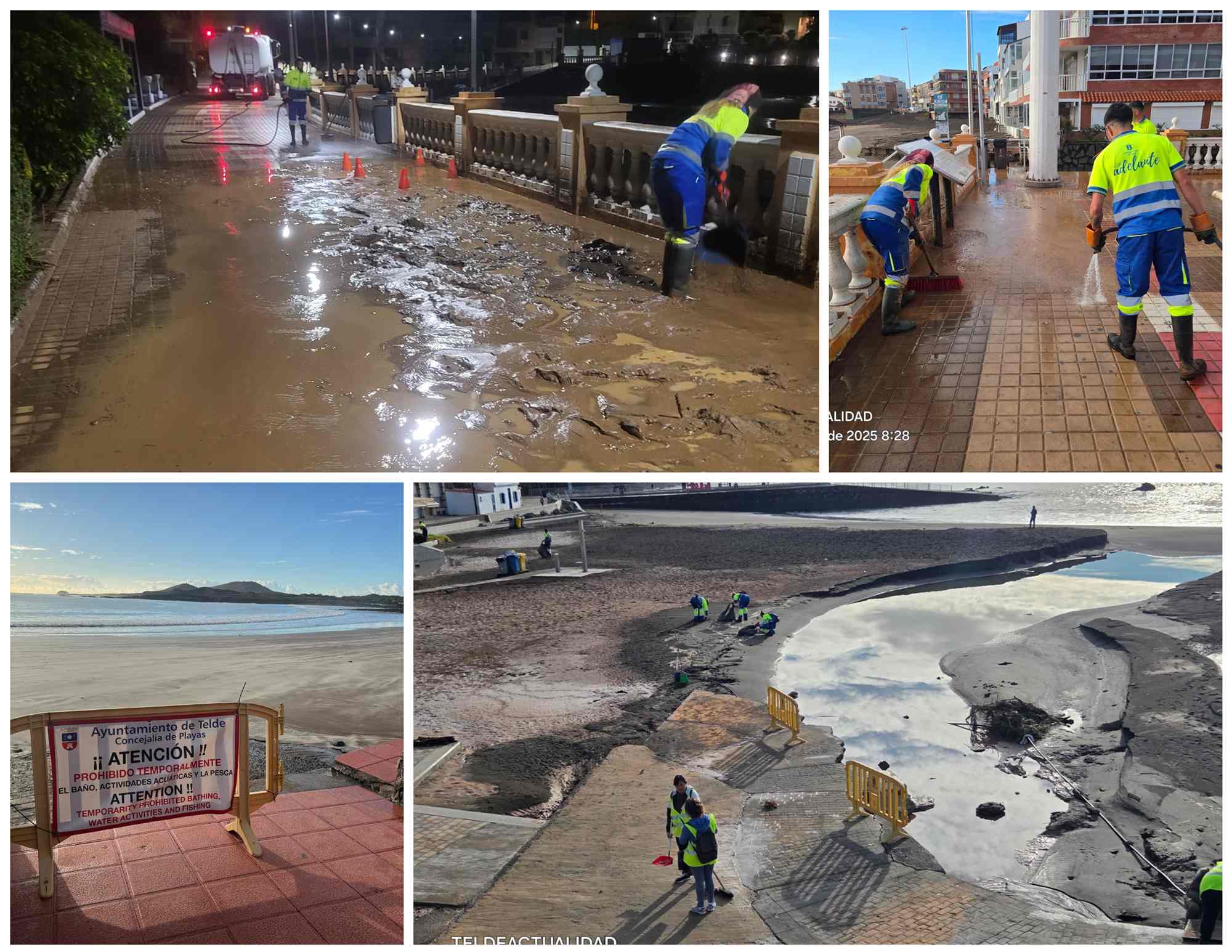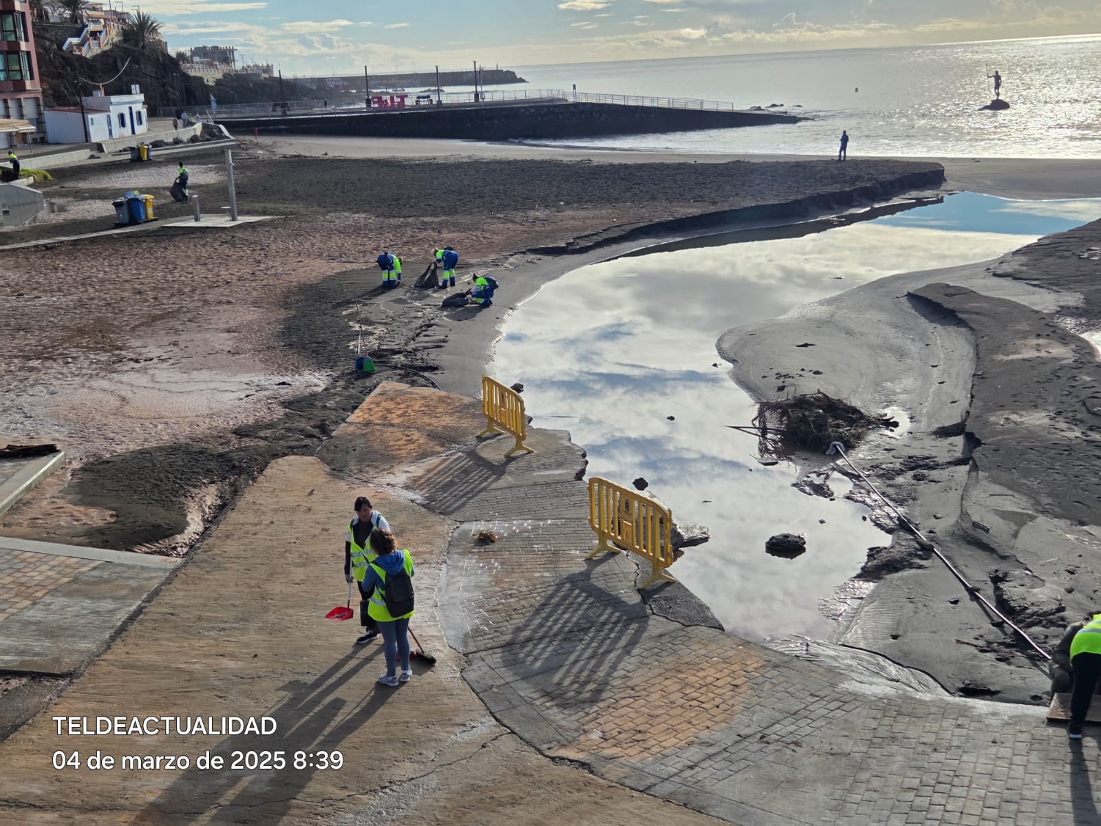 Los trabajos de limpieza y recuperación continúan en la costa de Telde, de forma especial en Salinetas, la zona más afectada por la tromba de agua que azotó Telde este lunes. Como medida preventiva, Playas ha cerrado al uso las calas del municipio por el riesgo de peligro y mientras duren las labores de adecentamiento.