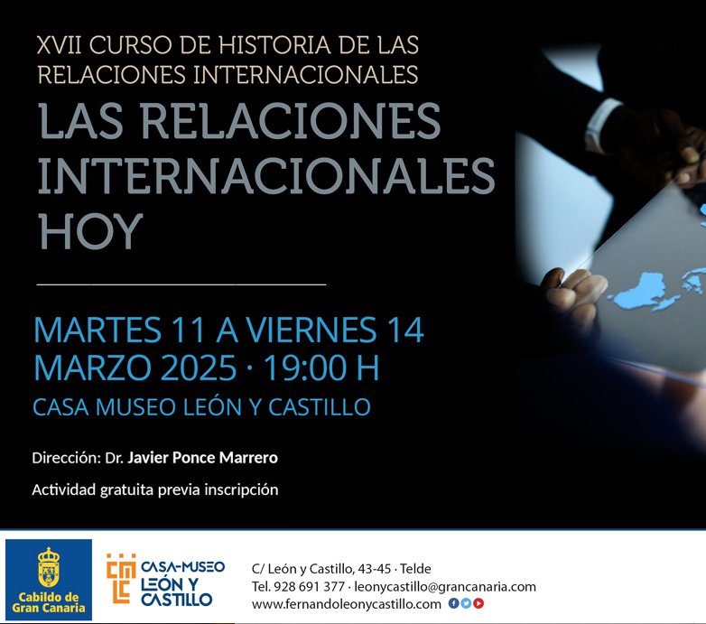 Como advierte el director de esta iniciativa, el profesor Javier Ponce, el curso de Historia de las Relaciones Internacionales se enmarca “en el compromiso de la Casa Museo León y Castillo de Telde por fomentar el debate y la reflexión sobre la evolución del sistema internacional. La actual coyuntura global, marcada por conflictos armados, reconfiguraciones geopolíticas y el impacto de las grandes potencias, exige un análisis profundo que permita entender los factores que moldean el mundo contemporáneo”.