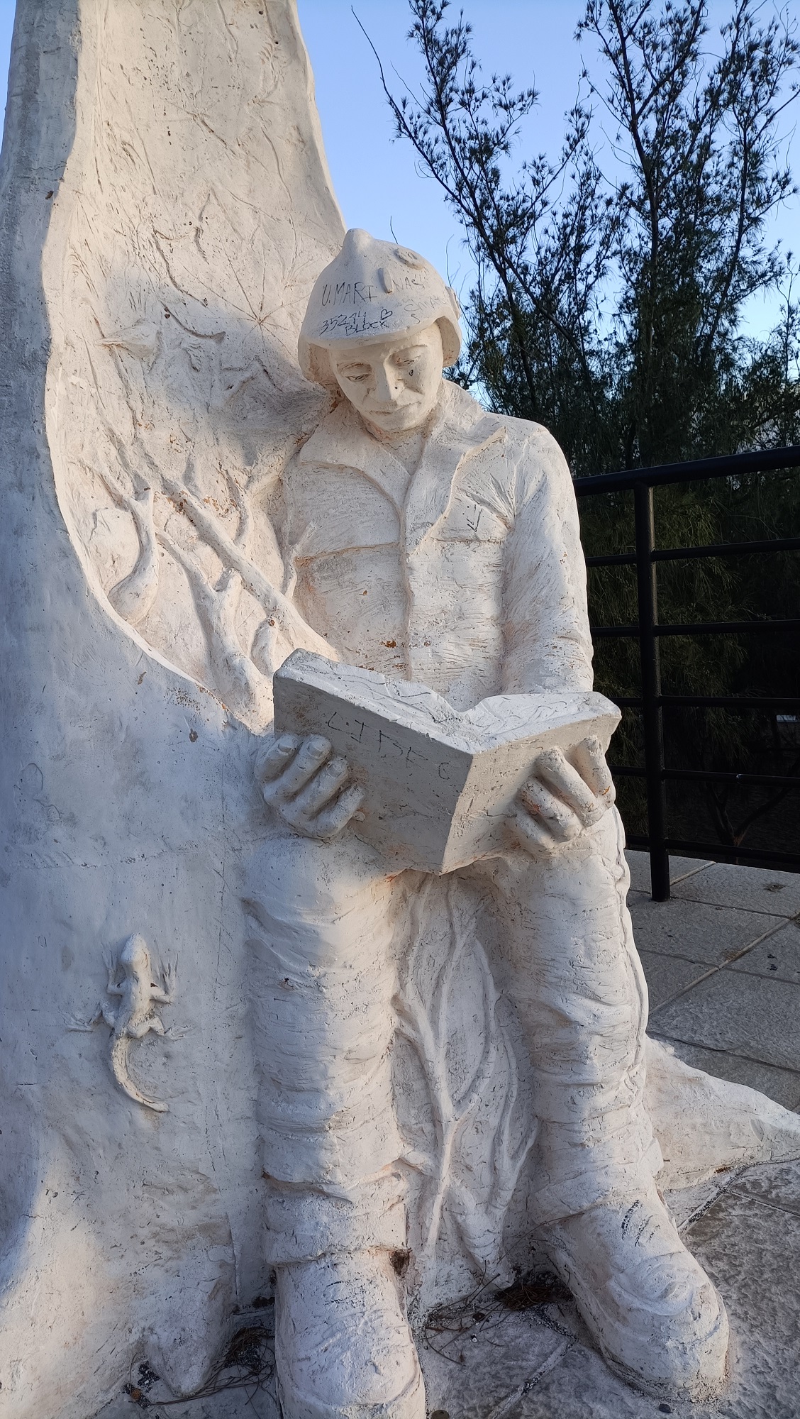 Yo me detengo ahora, justo dos años después, a observar la escultura. Protegida tras una cadena metálica –tristemente debe ejercer de barrera disuasoria ante aquellos que, desde la ignorancia y su falta de civismo, no respetan el patrimonio de todos-, observan la figura de un agente de medio ambiente presto para la acción, con la vestimenta propia de quien va a enfrentarse a las llamas de un incendio. Curiosa es una salvación, sus manos no portan una manguera ni herramientas contraincendios. Sus manos sostienen un libro abierto, la cabeza inclinada y su mirada nos confirman que su mente está inmersa en su lectura.
