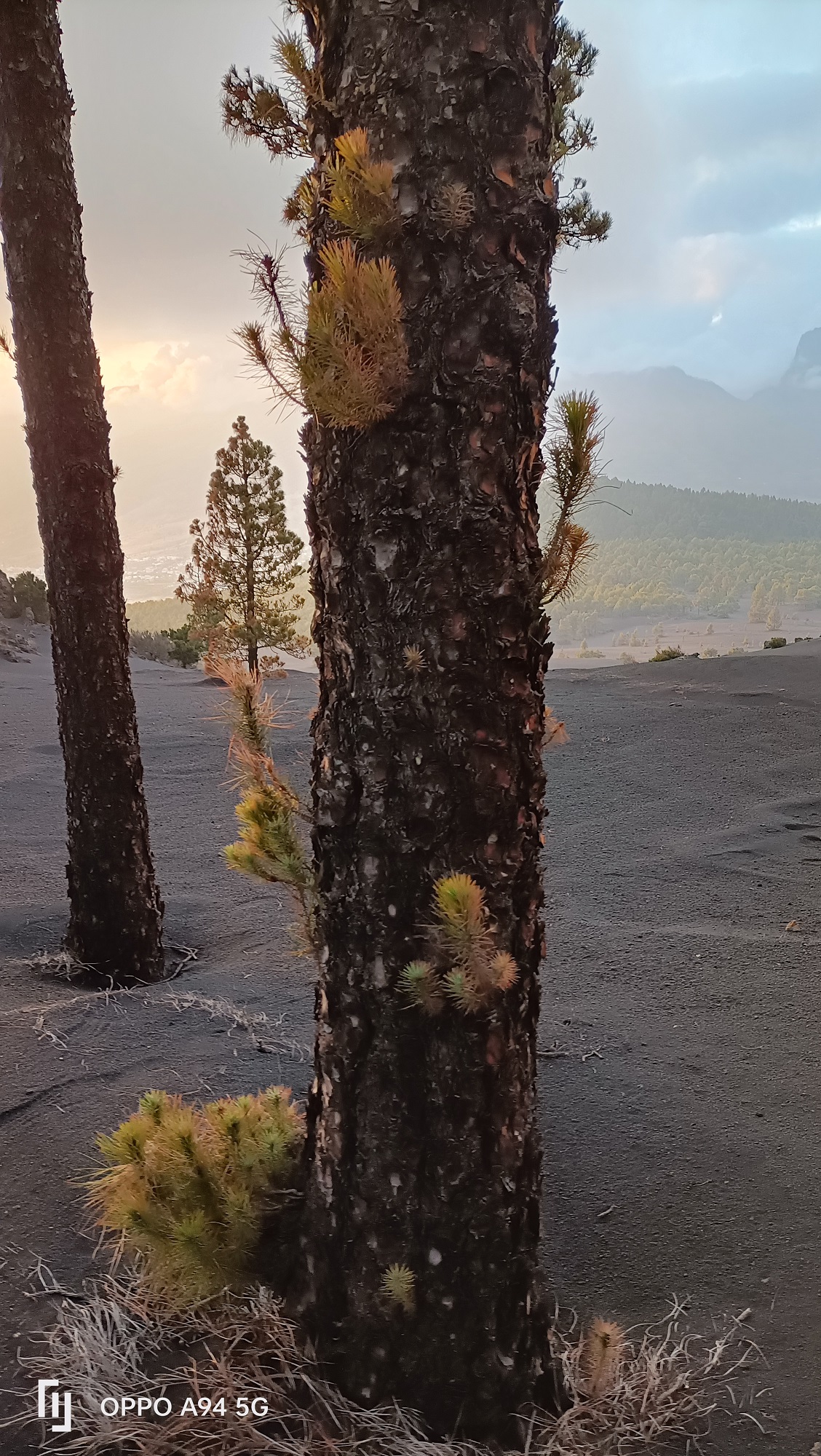 De la negritud que lo cubría todo, brotaban sobre troncos quemados por las altas temperaturas, esperanzas verdes. Observé con calma los pinos canarios que comenzaban a dar una respuesta viva a la fiereza del volcán, al calor sin límite.