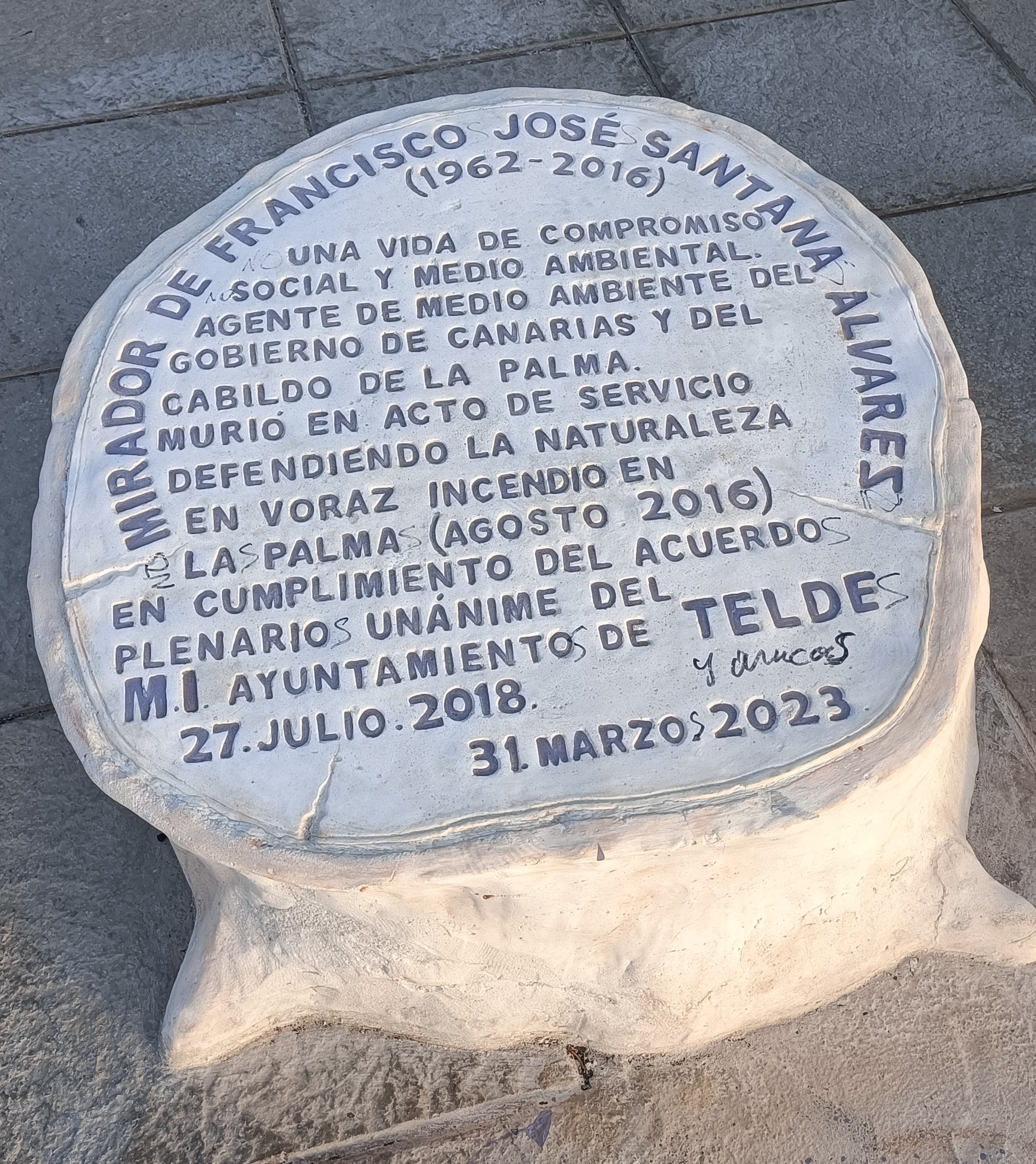 1962-2016. Una vida de compromiso social y mediambiental. Agente de Medioambiente del Gobierno de Canarias y del Cabildo de La Palma. Murió en acto de servicio defendiendo la naturaleza en voraz incendio en La Palma (agosto 2016). En cumplimiento del acuerdo plenario unánime del M I. Ayuntamiento de Telde (27 de julio de 2018)