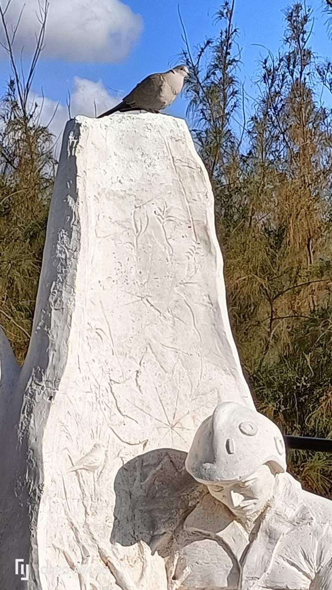Una tórtola turca permanece posada sobre su cabeza. Está ahí desde mi llegada. Sólo cuando me levanto para retirarme, inicia su vuelo -es curioso que siempre que me he acercado al mirador y observó la escultura, una tórtola, a veces dos, permanece posada sobre su casco-.