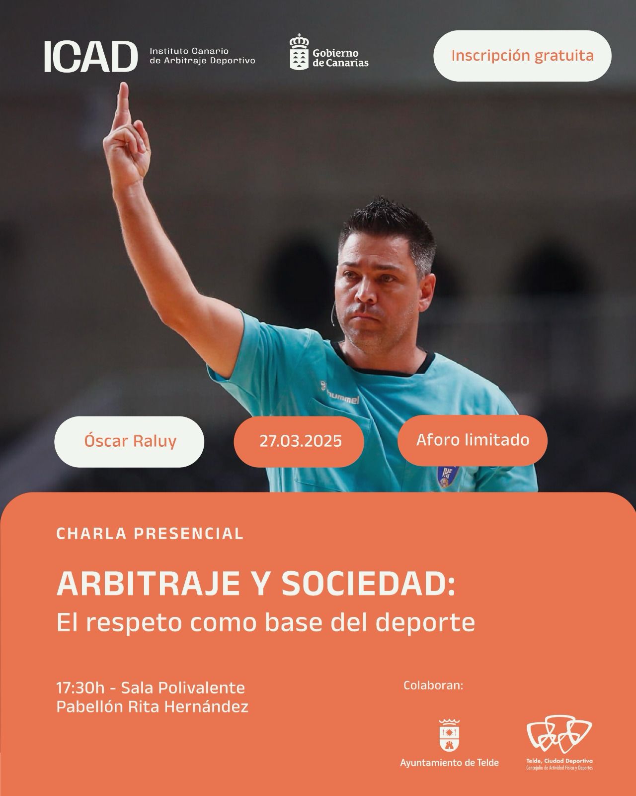 Además de con con la colaboración de la Concejalía de Actividad Física y Deportes del Ayuntamiento de Telde, que dirige Cristhian Santana Caballero, esta actividad contará con la participación del teldense Óscar Raluy, ex árbitro profesional con amplia experiencia y actual miembro del Comité de Expertos del ICAD, quien abordará temas como La realidad del colectivo arbitral: retos y dificultades y Estrategias para fomentar el respeto en entornos deportivo.