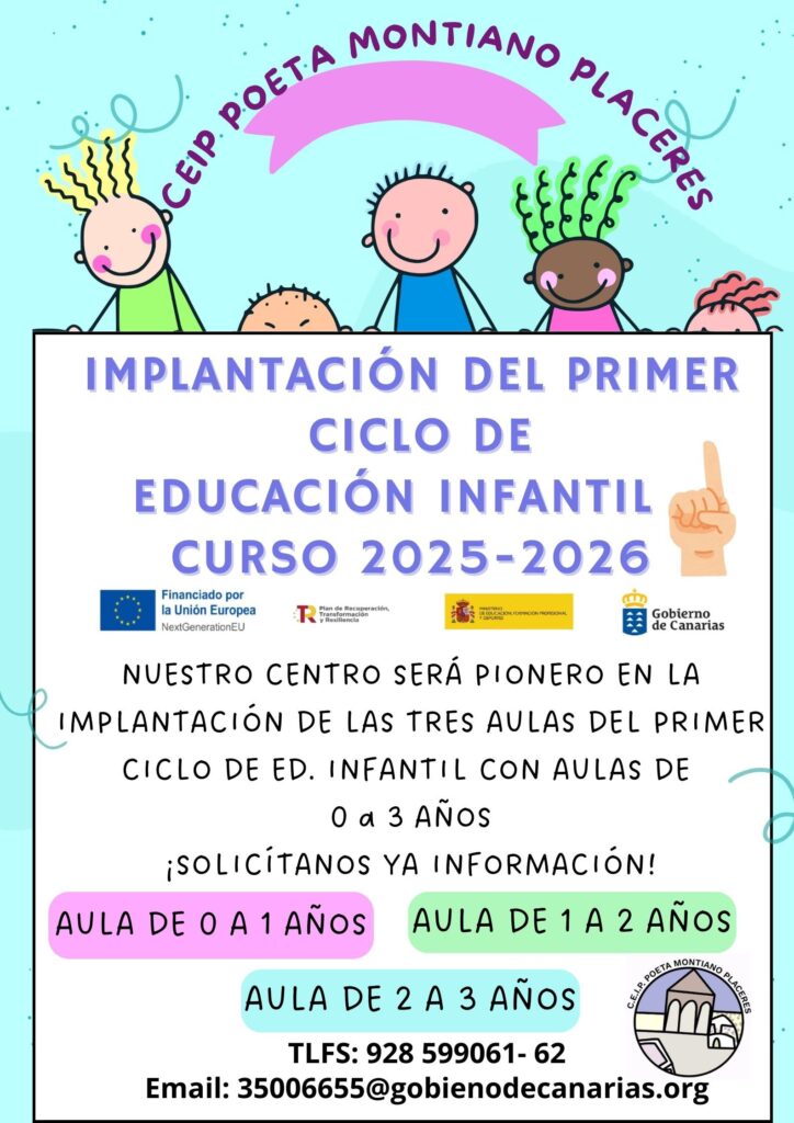 Canarias tiene previsto crear un total de 3.879 plazas dentro de este programa antes del 31 de diciembre de 2025. Como parte de este compromiso, el CEIP Poeta Montiano Placeres acogerá tanto el primer como el segundo ciclo de Educación Infantil, ampliando así su oferta educativa para niños y niñas desde los 0 hasta los 12 años.