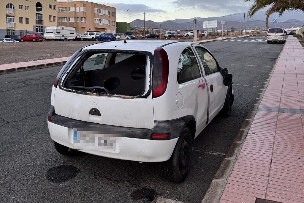 Vecinos de Las Huesas denuncian la presencia de un vehículo abandonado con las lunas rotas junto al campo de fútbol del barrio.