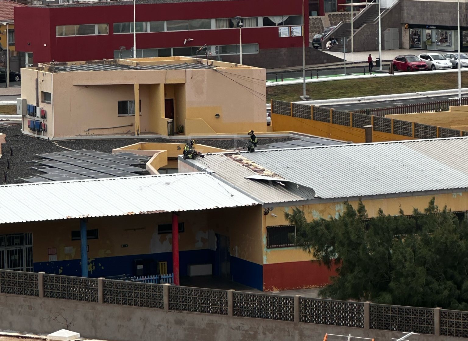 Bomberos del parque zonal de Telde se encuentran actuando en estos momentos en el CEIP La Garita para reforzar una plancha metálica del techo que ha sido levantada por el fuerte viento registrado este domingo en la zona, en un incidente que ha generado alarma entre vecinos y miembros de la comunidad educativa, tal y como adelantó TELDEACTUALIDAD.