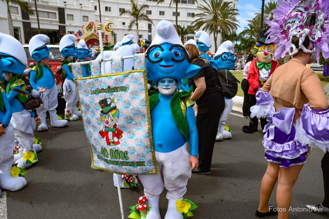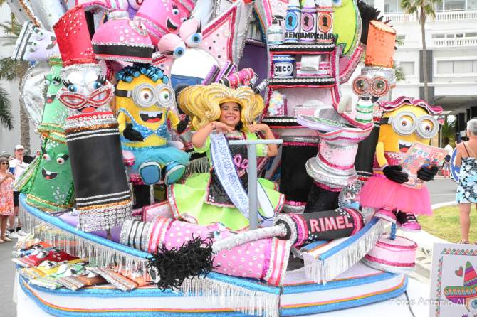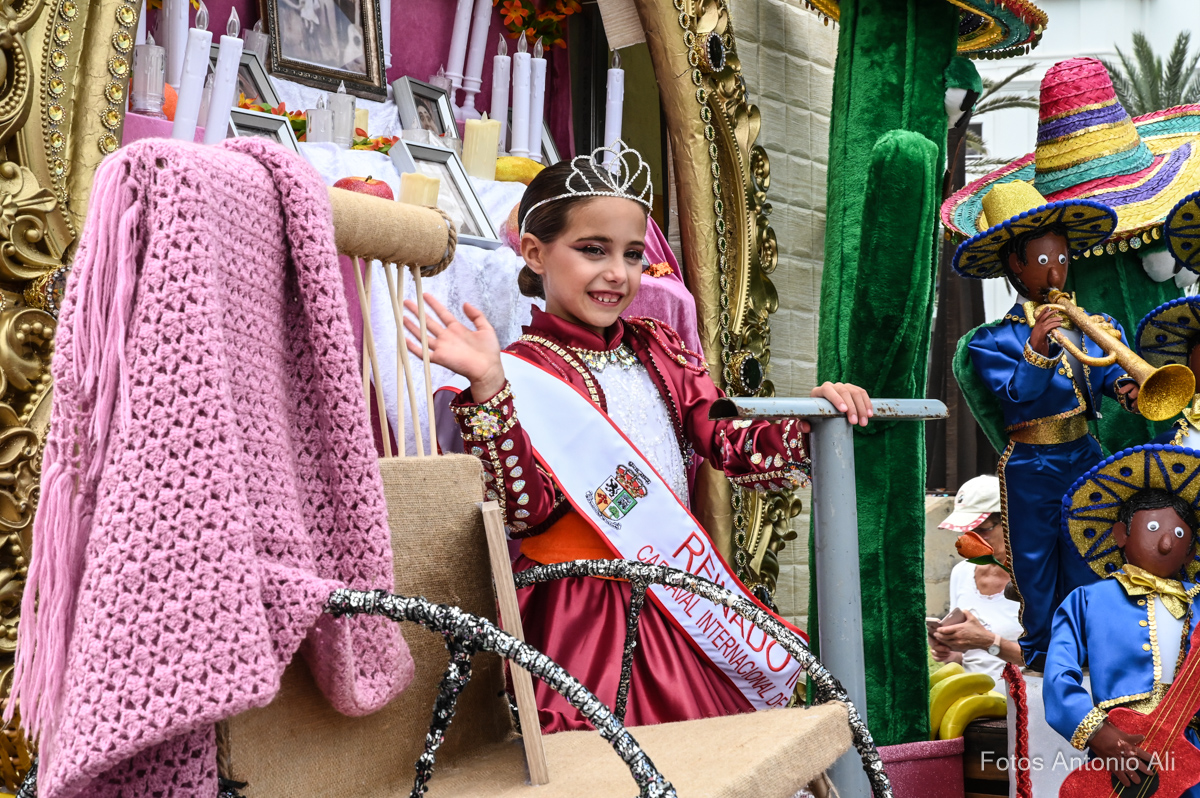 La Cabalgata Infantil también contó con la participación de las tres niñas premiadas del Reinado Infantil junto a varias batucadas, las murgas Los Legañositos y Los Chachitos, el Mini Tren de Playa del Inglés, personajes populares de nuestro carnaval como El Escocés y Cantinflas o las comparsas infantiles Lianceiros y Brisa de Volcán (que ya celebra su vigésimo aniversario).
