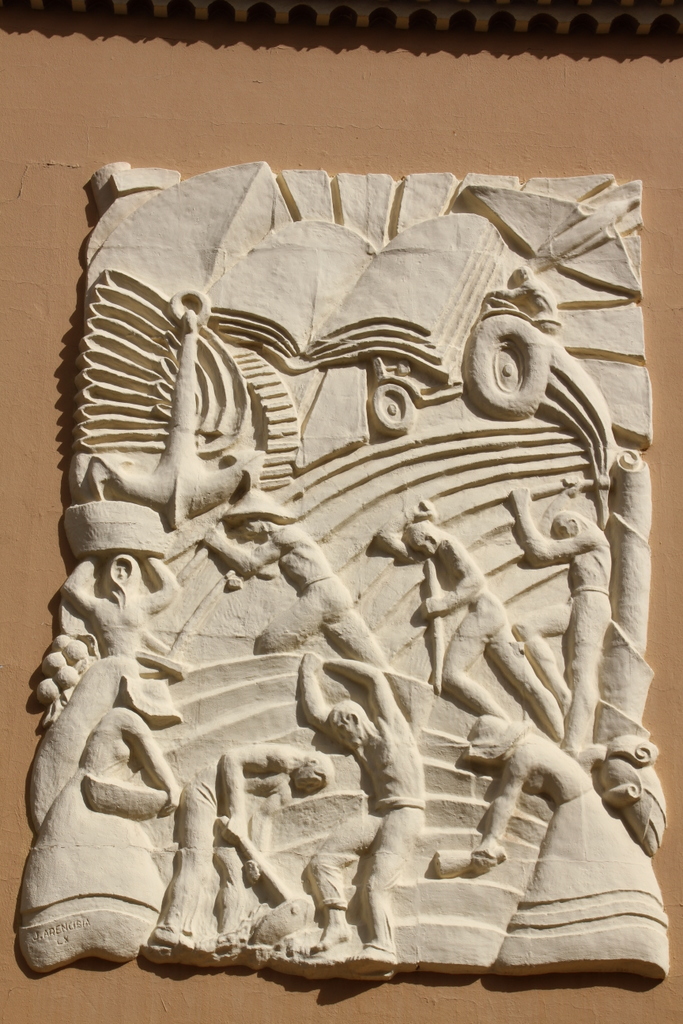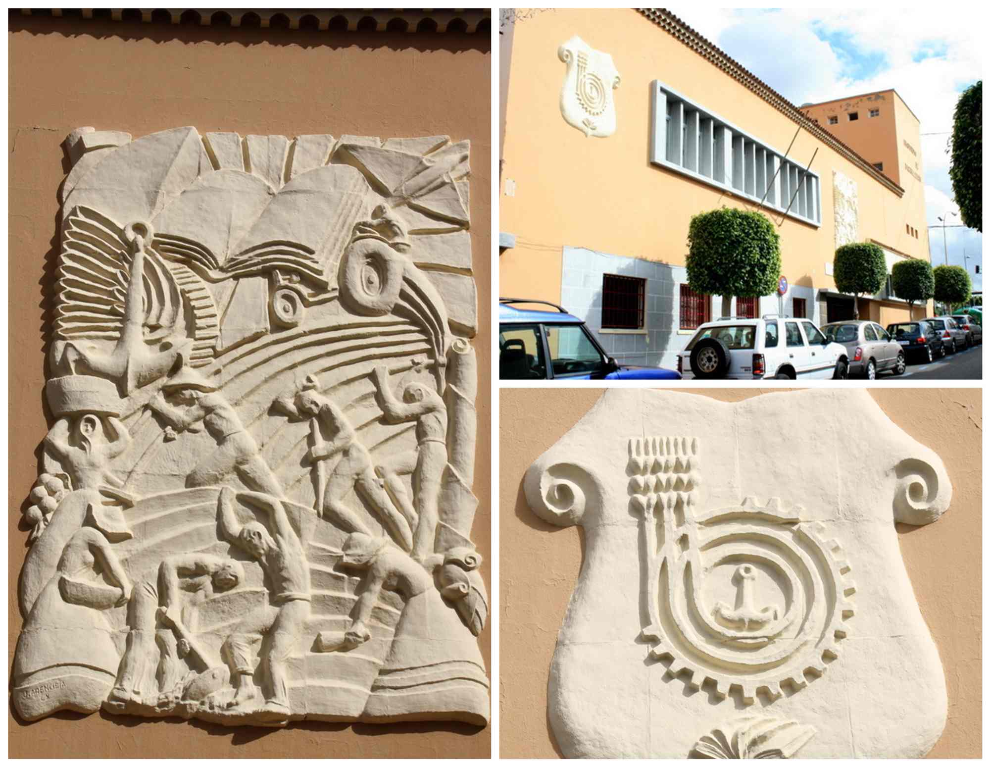 En el mismo, observamos un fondo, determinado por líneas paralelas en distintas direcciones, recordando los surcos que se forman para la plantación agrícola, una serie de personajes en la parte inferior, casi formando un arco con la situación y posición de las dos figuras femeninas, que se hallan a cada lado, tocadas con sombreros de anchas alas para refugiarse del Sol y luego, en medio, dos hombres que se hallan en labores propias del campo, cuyas posiciones nos recuerdan las imágenes pictóricas interiores realizadas por el propio artista para el vestíbulo del Edificio A del IES José Arencibia Gil. A continuación y en una zona superior, se hallan otros cuatro personajes; esta vez, con la presencia de una sola mujer en el lado izquierdo, que porta un enorme cesto con sus dos manos. En la misma línea de ubicación, pero ya desplazándonos al lado derecho, se hallan tres figuras masculinas; una tocada con un sombrero, a la que le sigue en disposición otra igual pero sin el referido tocado, que parecen arrastrar un arado y en el lado opuesto a la figura femenina de este segundo nivel, un hombre que a manera de atlante, sostiene lo que parecen ser telas de empleo agrario, totalmente enrolladas. Ya en la parte superior, la figuración sólo viene determinada por el personaje que conduce un tractor en clarísima alusión al que poseyó el antiguo Instituto Laboral y que hoy en día se halla a manera de objeto artístico en una rotonda. Por otro lado, un enorme libro abierto ocupando toda la parte central, un ancla marinero en la parte izquierda y en el ángulo superior derecho, lo que parece un avión con sus alas desplegadas en el ángulo.