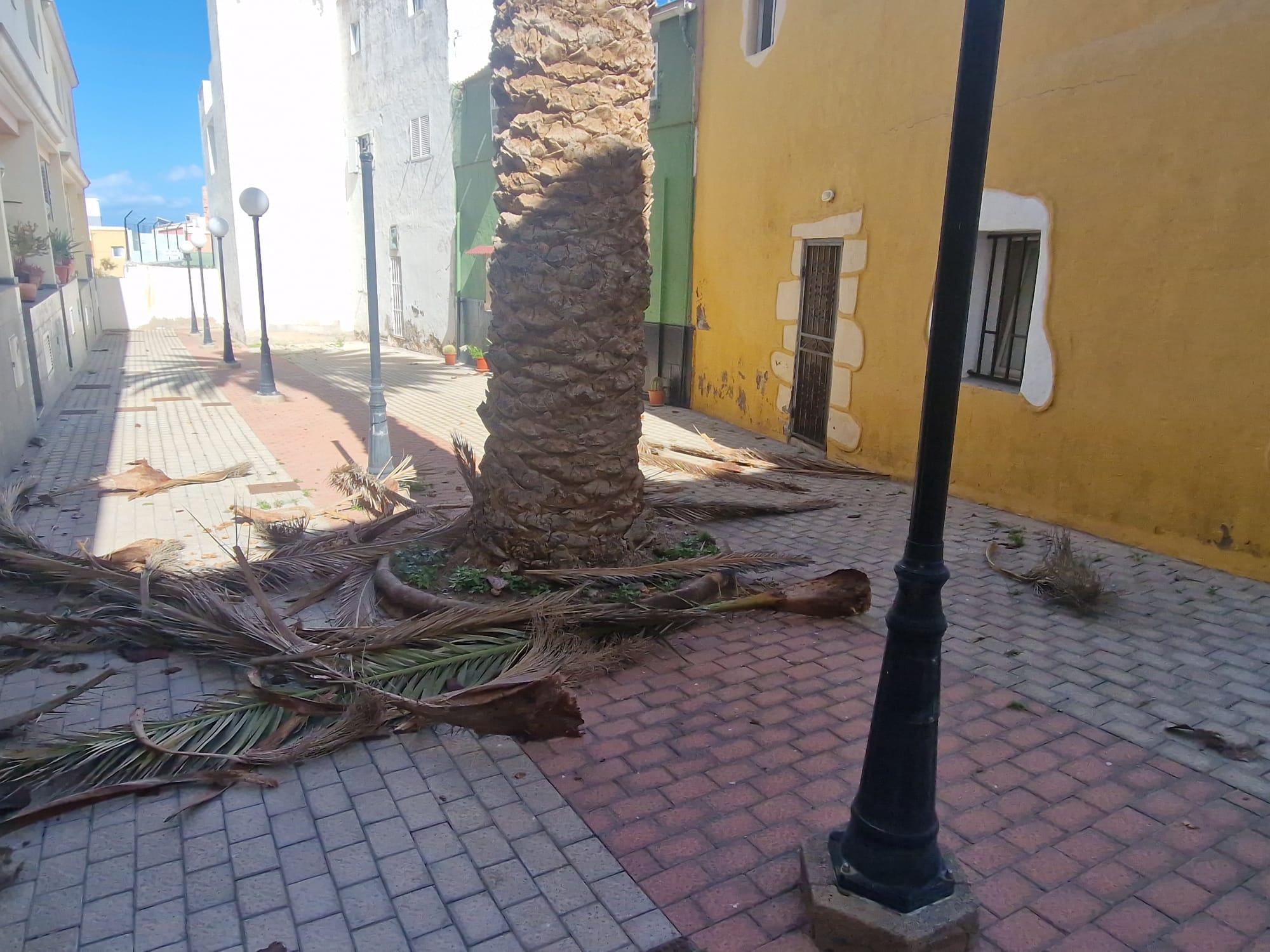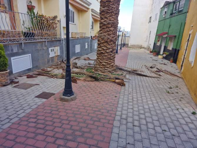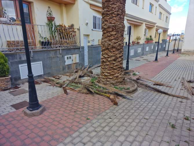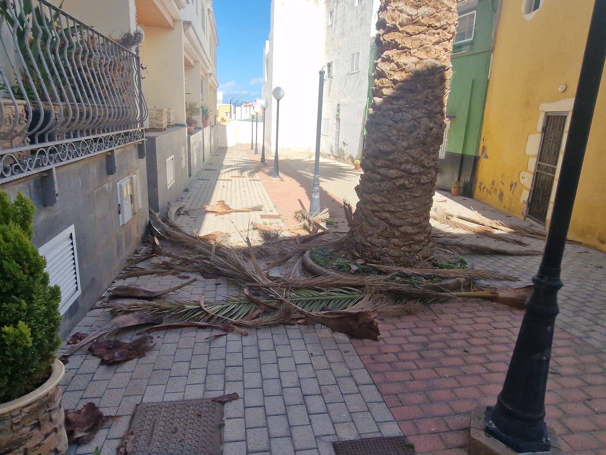 La situación se agravó tras el reciente temporal de viento, que derribó numerosas ramas de la palmera afectada. A pesar de alertar a la Policía Local, los agentes comunicaron que solo podrían intervenir si se producían daños personales o materiales, limitándose a solicitar fotografías del incidente. "Entiendo que durante el temporal no pudieran actuar, pero hoy es sábado y seguimos esperando. Al final seremos los propios vecinos quienes tengamos que limpiar la zona", lamenta.
