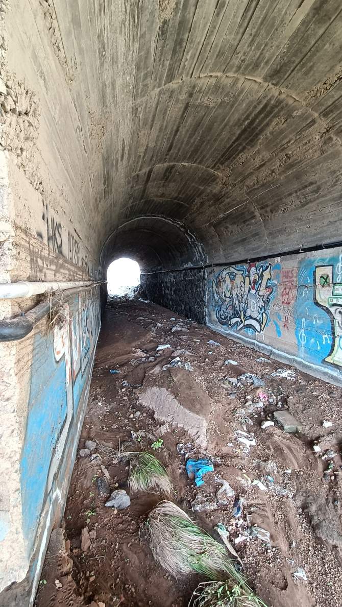 Aquí se produce el segundo estancamiento. Sólo hay un tubo de poco diámetro, sesenta centímetros como máximo, que se ha dejado para el paso de servicios como tuberías de agua y otras canalizaciones. En la Dana del pasado marzo, las aguas de arrollada, lo cegaron con piedras y barro a las primeras de cambio y el resultado fue una represa de agua y barro que terminó desbordando al no existir un cauce por donde discurrir las aguas pluviales, creándose un cauce improvisado en la vía del nudo de enlace y colapsando el tráfico bajo el puente de la autovía pues llegó a registrar medio metro de altura en su zona más profunda, hecho que confirman las señales del barro presentes en la pared y el hecho de que un camión colapsara bajo el mismo-, impidiendo la circulación del resto de vehículos.