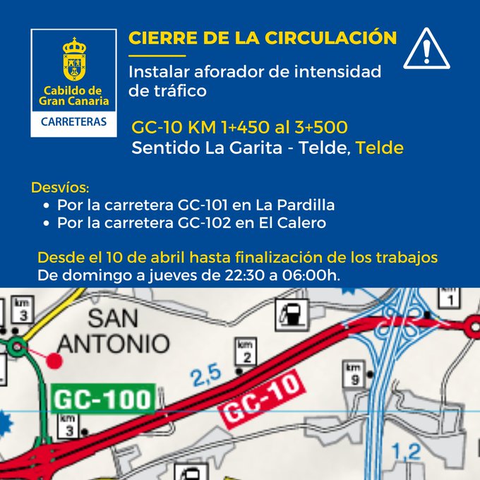 El Cabildo de Gran Canaria cerrará de noche la circulación de la Avenida del Cabildo (GC-10), entre los kilómetros 1+450 y 3+500, en el sentido La Garita – Telde, para instalar un aforador para medir la intensidad del tráfico. Los trabajos se realizarán de domingo a jueves de 22.30 a 6.00 horas.